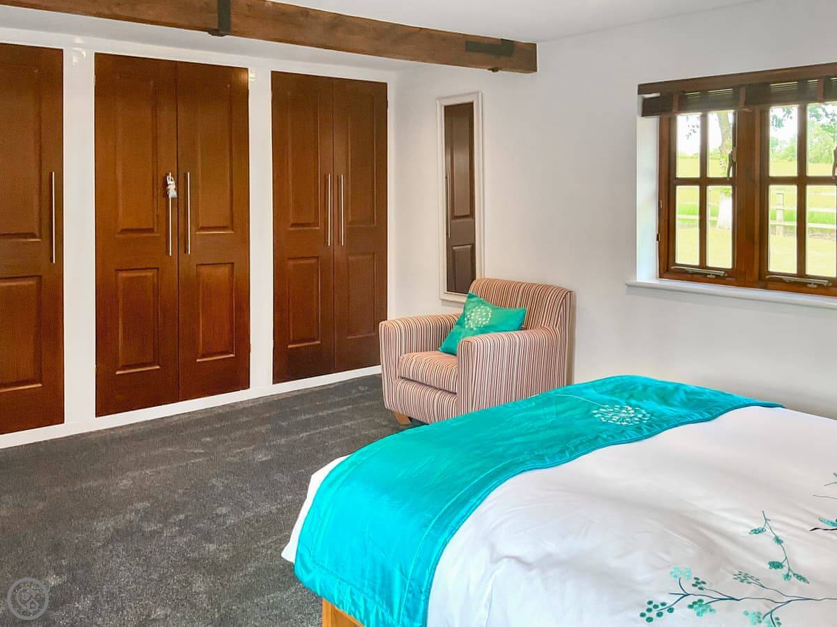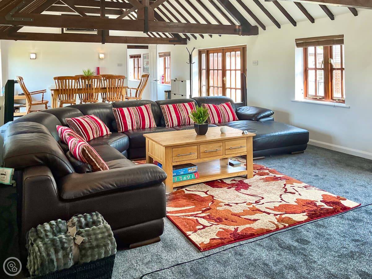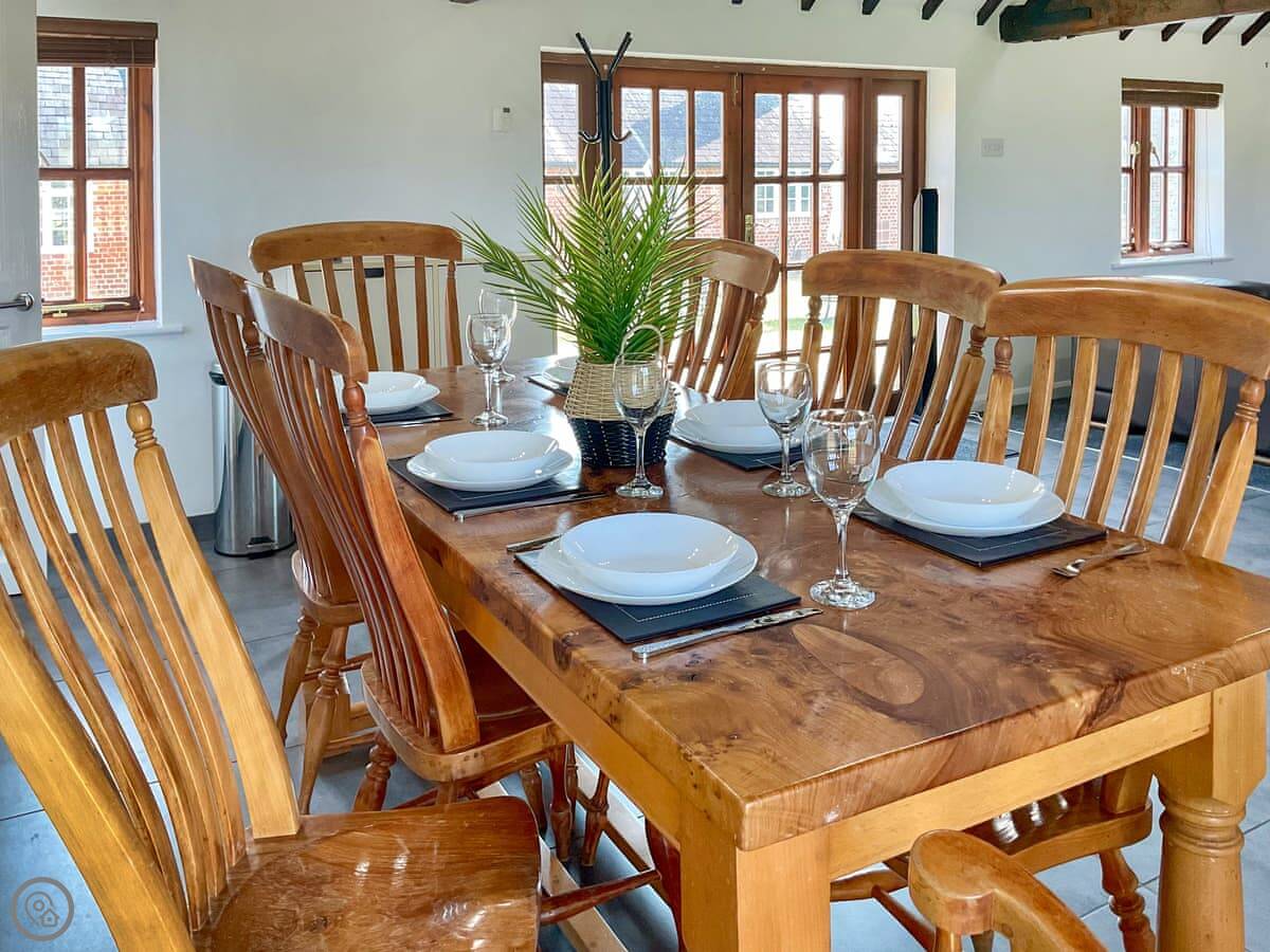Inside, it's a big open space with a high ceiling so it feels light. The kitchen's properly equipped, with a dishwasher and washing machine. There's a nice patio with a table and a BBQ, looking out over the garden and the fields.