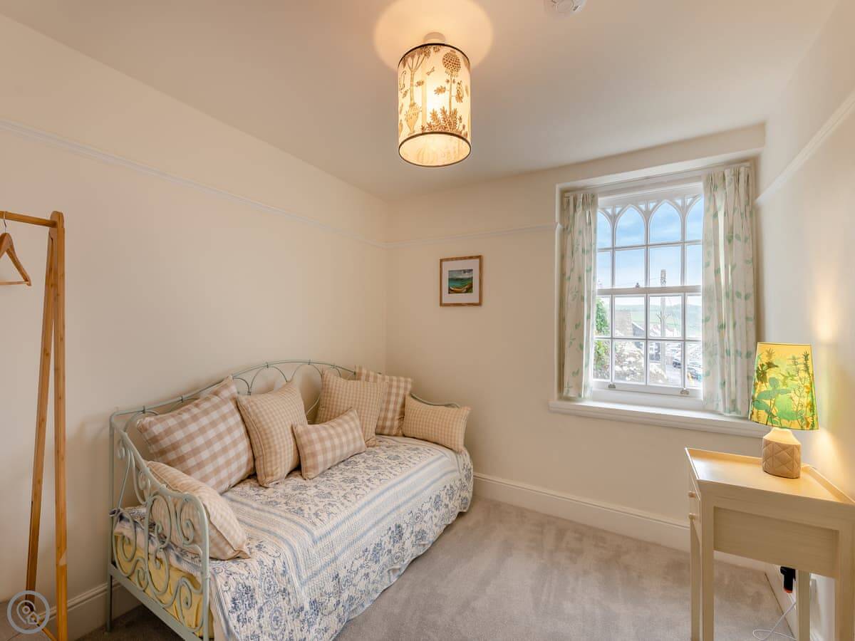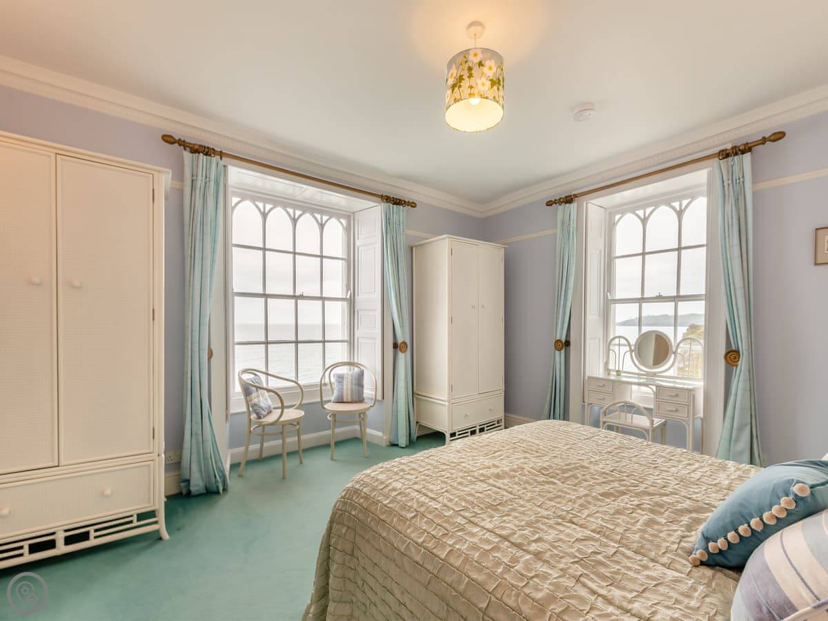 It sleeps five people. Three bedrooms, two bathrooms. The rating is 4 Star. It's comfy and clean, not too fancy. The main bedroom looks straight out over the beach. There's parking for two cars on the drive, which is a real bonus here.