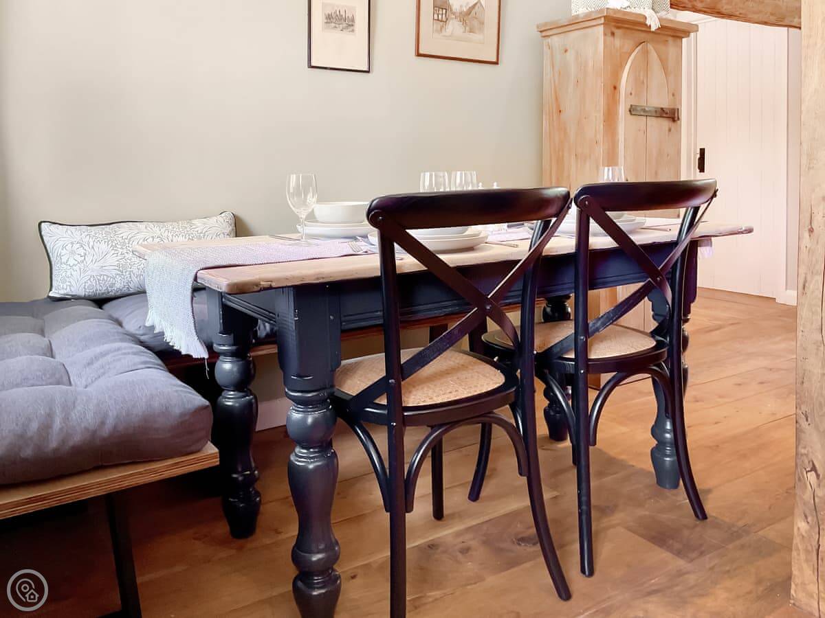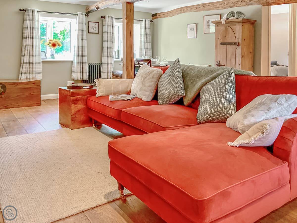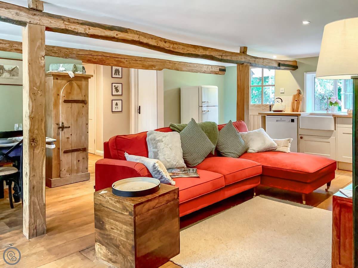 It's been done up to a good standard. Solid oak floors, big windows, and the original oak beams are still there. It's open plan inside, so the kitchen, living and dining areas are all one space. It sleeps four, in two bedrooms. Each bedroom has its own shower room. There's a washing machine and dishwasher. Bedding and towels are included.
