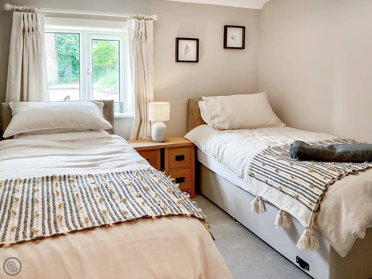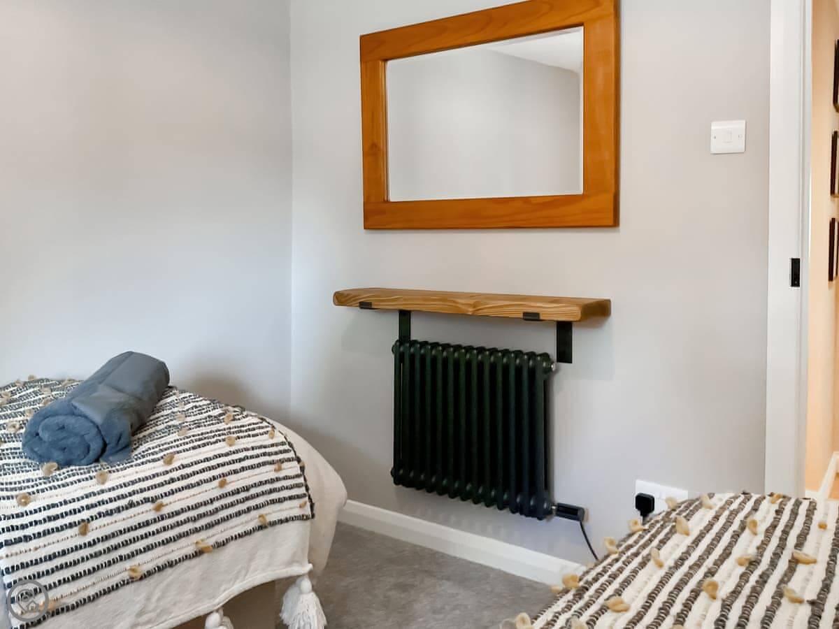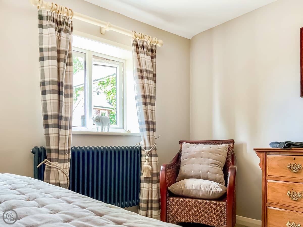 It's been done up to a good standard. Solid oak floors, big windows, and the original oak beams are still there. It's open plan inside, so the kitchen, living and dining areas are all one space. It sleeps four, in two bedrooms. Each bedroom has its own shower room. There's a washing machine and dishwasher. Bedding and towels are included.