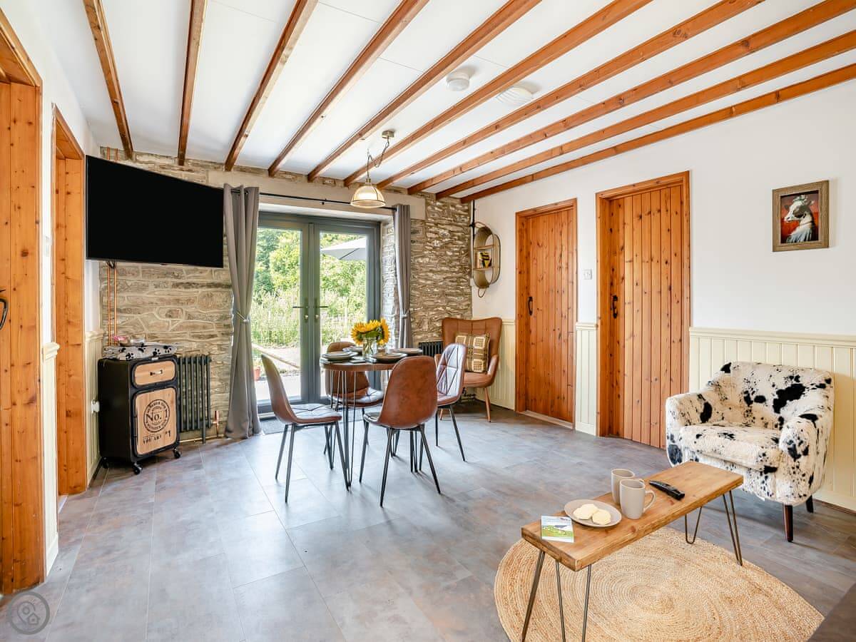 The Old Cowsheds 1, Dairy, is one of three conversions on the site. It's near Cribyn, between Lampeter and Aberaeron. The buildings are old stone, converted about ten years ago.