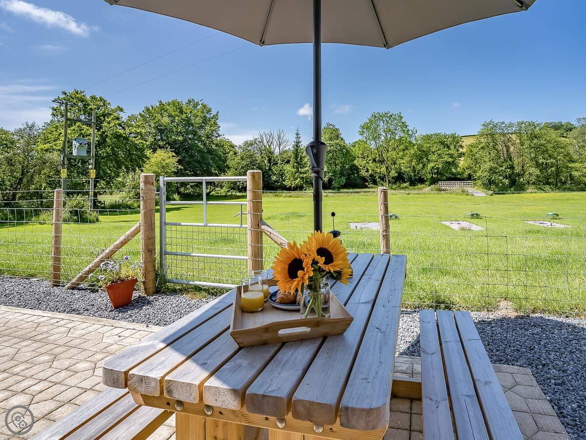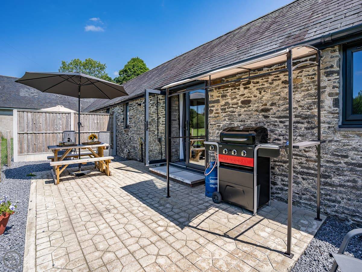 Outside, there's an enclosed garden with a table, chairs, and a gas barbecue. It looks out over the owner's land. The parking is right there.