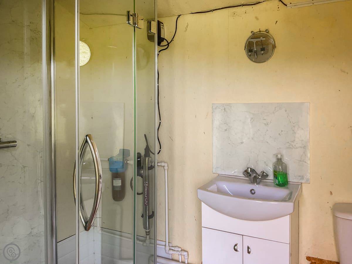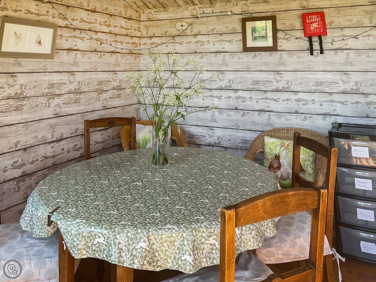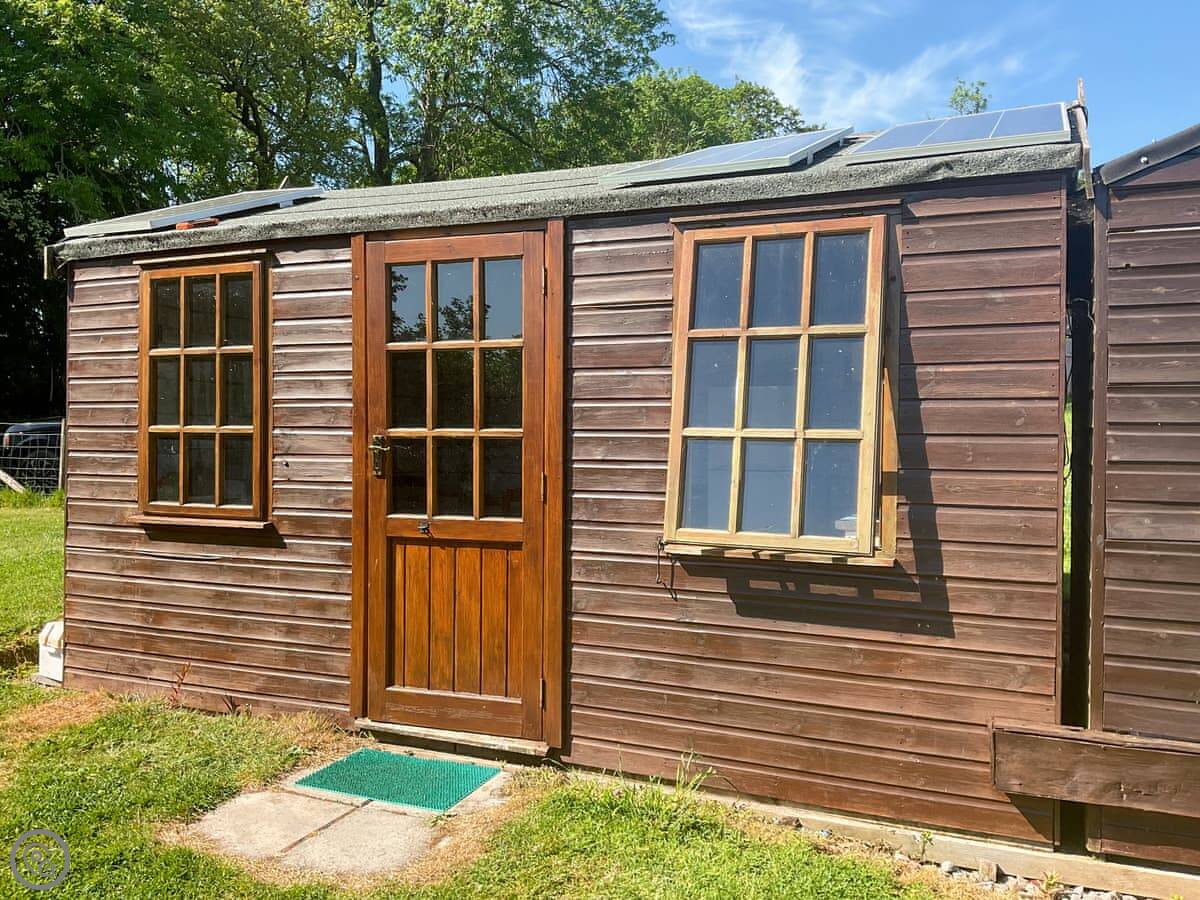It's for two people. There's a double bed and a wood burner. The kitchen and shower are shared with the other two huts. The kitchen has a gas cooker, fridge-freezer and microwave.