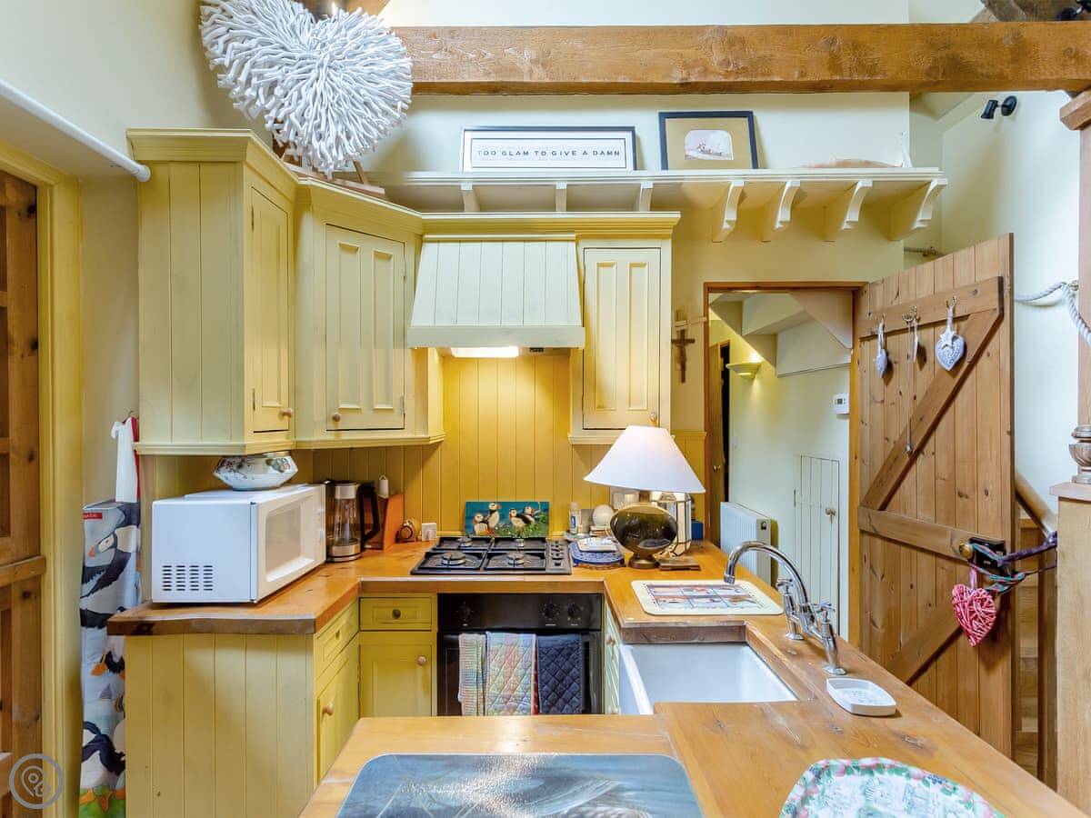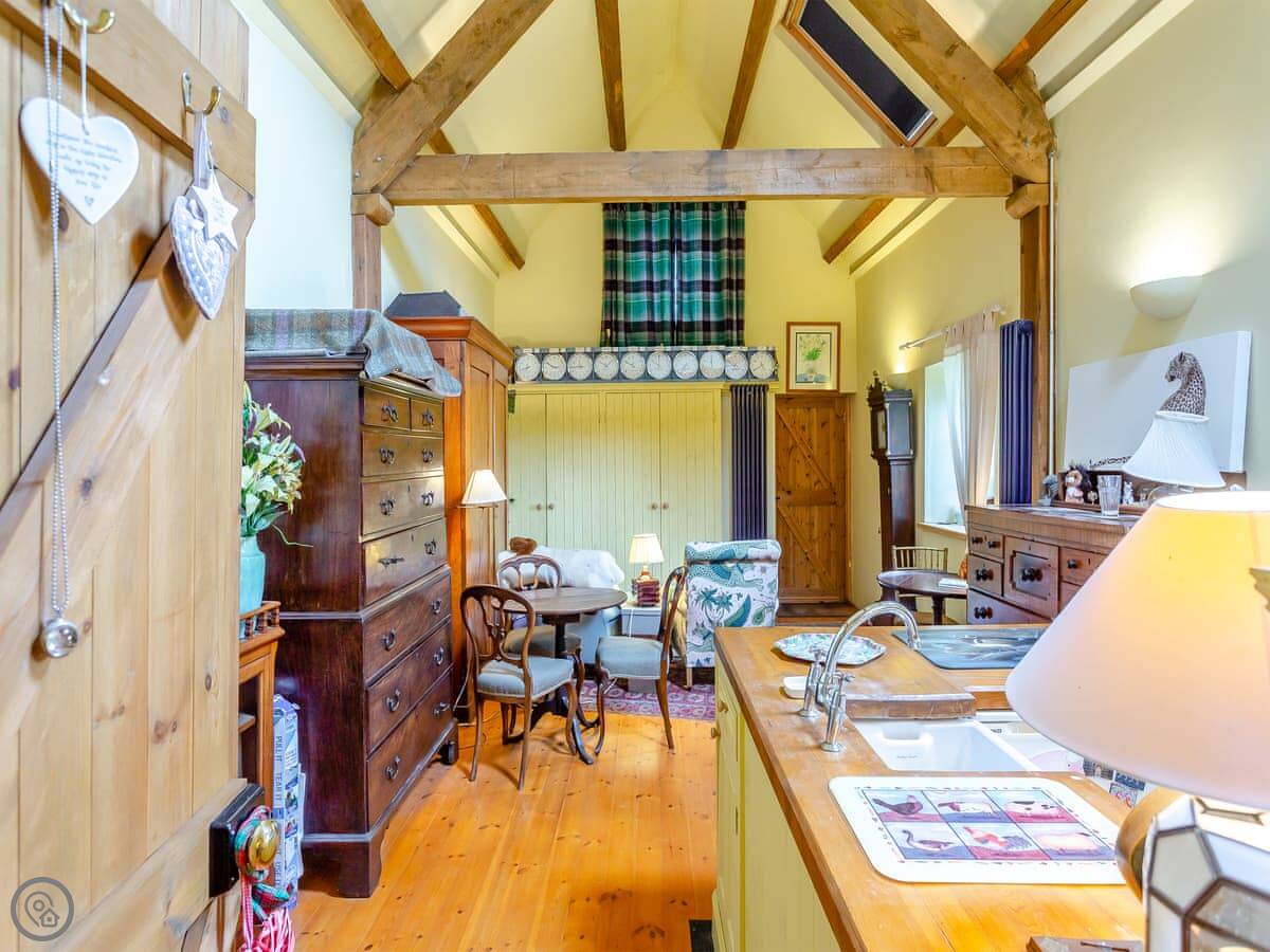 There’s parking for one car right outside. The kitchen is open plan with the living room. All the bedding and towels are included. You can bring one well-behaved dog.