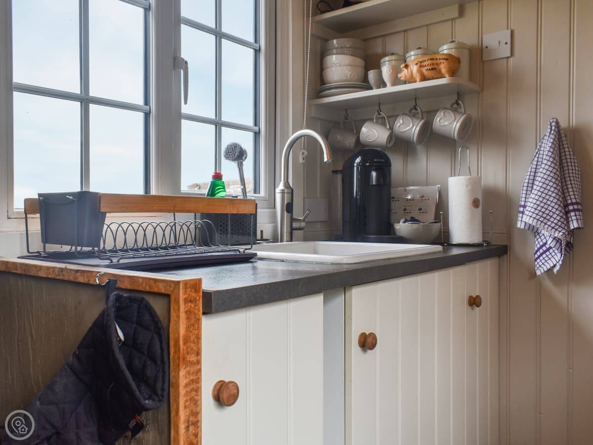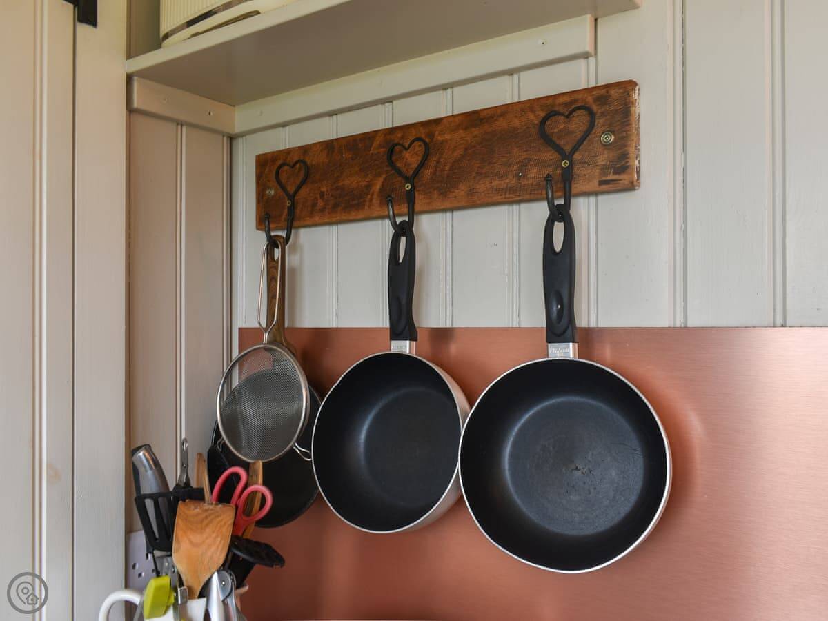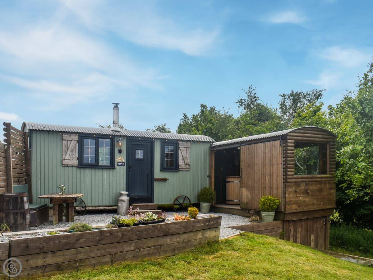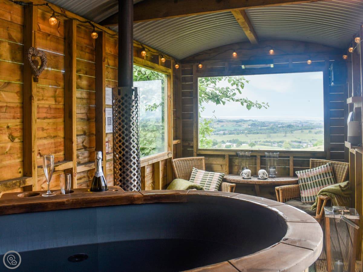 It sleeps two, in a sofa bed. It's a proper sofa bed though, with a pocket-sprung mattress. It's all one room inside, with a small kitchen area and a shower room. There's a wood burner for heat, which you'll probably need. The hot tub is in a separate hut next to you. It's wood-fired, so someone will come and show you how to use it when you arrive.