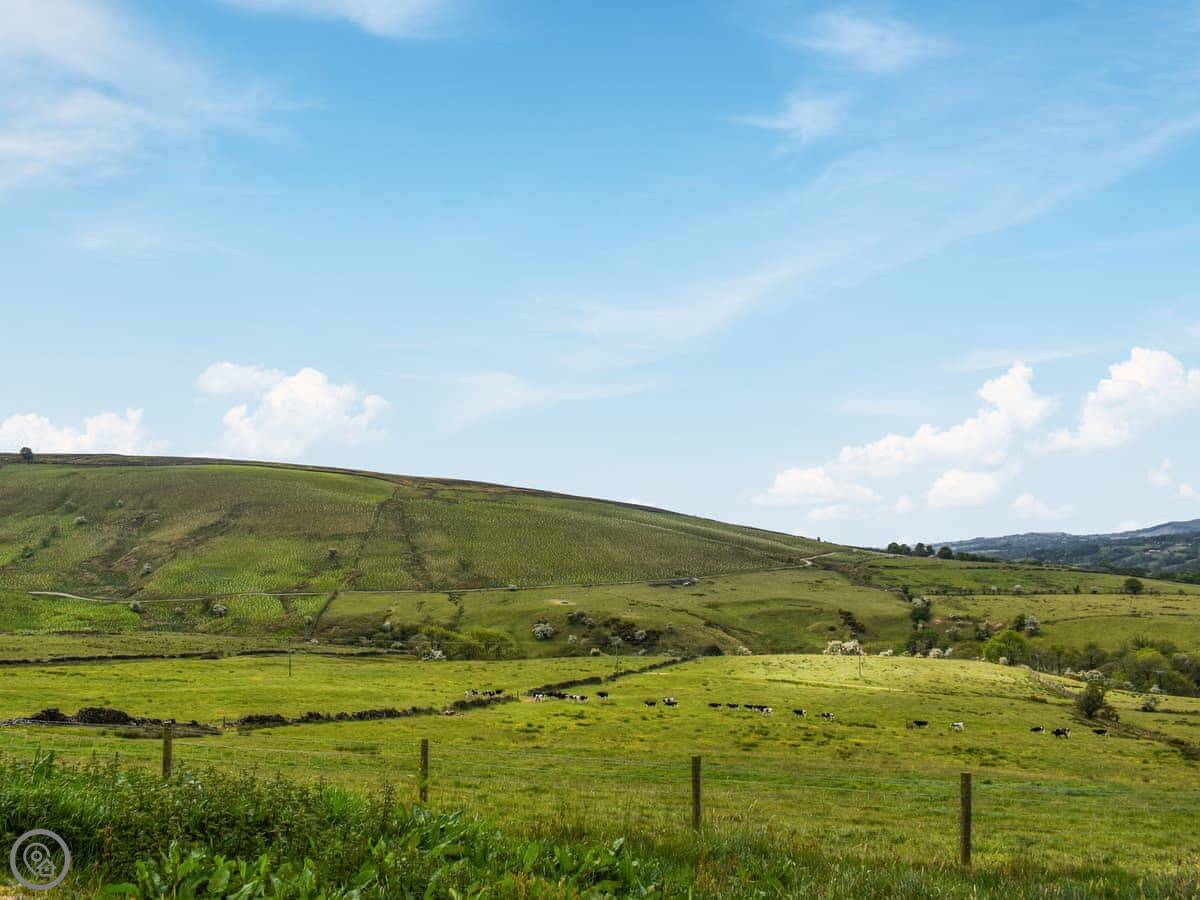 Bracken Hut is one of two huts here at Copy House. It's a shepherd's hut on a bit of a slope, so the views are good. You look out over fields towards the Yorkshire Dales.