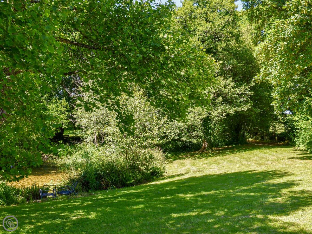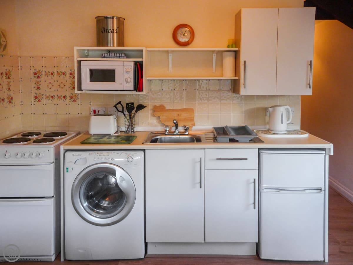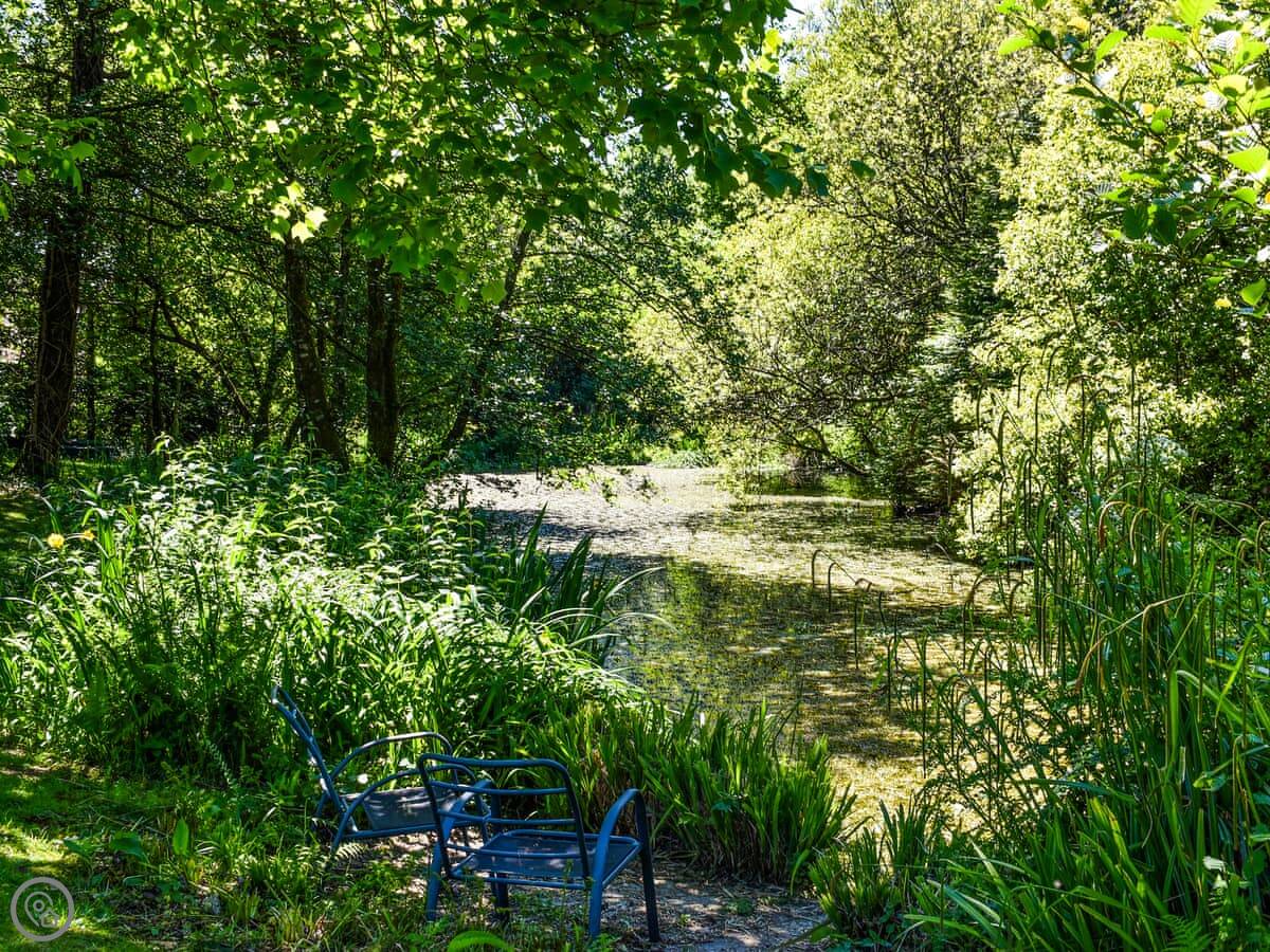 You enter into the main living area, which has the kitchen, dining and sitting space all together. There's a TV and a washing machine. Outside, there's a private seating area for the cottage, and you can also use the large shared garden. There's a big pond there with ducks.