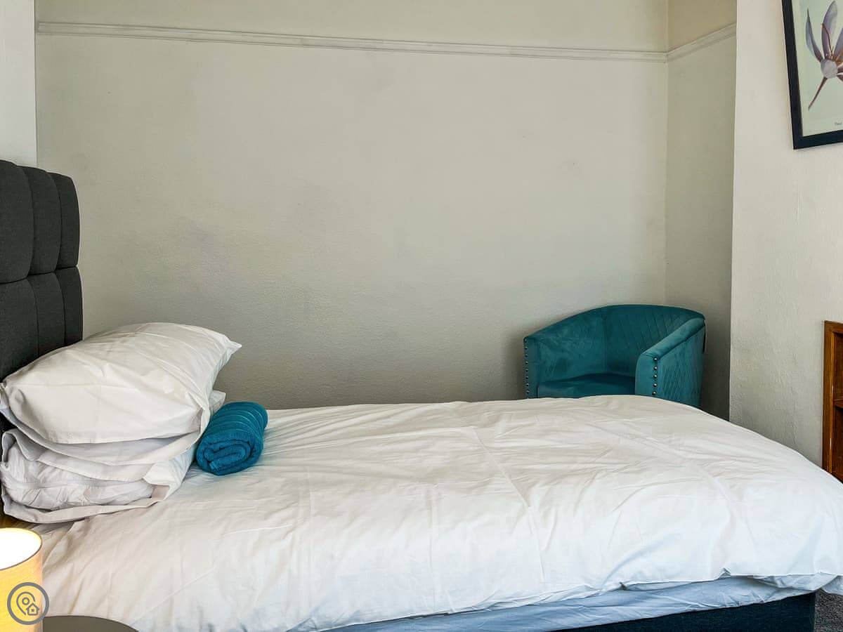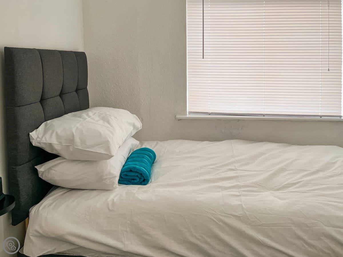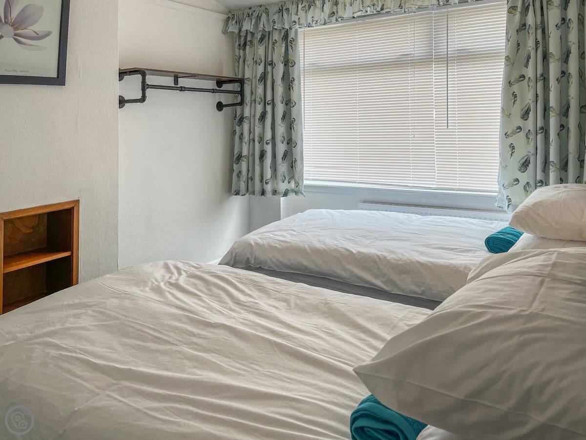 It sleeps five. Three bedrooms upstairs: one with a double bed, one with two singles, and one with a single bed. One bathroom. The rating is 4 Star, which means it's comfortable and well equipped.
