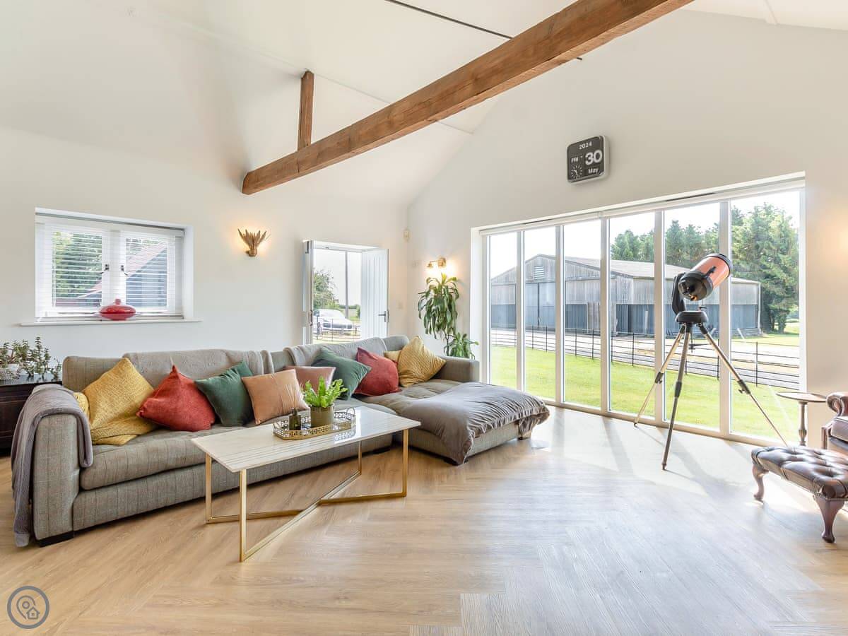 The main living area is open plan, so everyone's together. There's a proper kitchen, a dining table, and a sitting area with big windows looking out over the fields.
