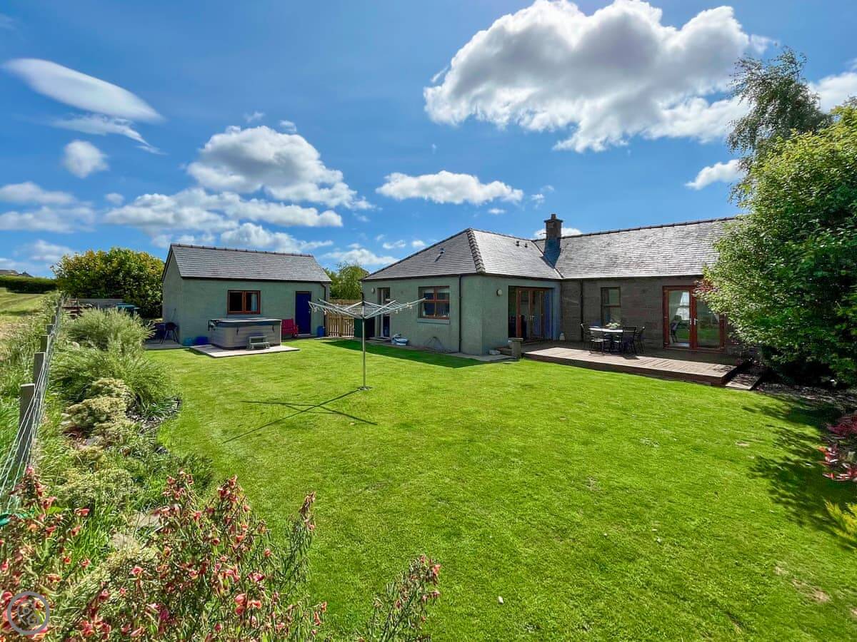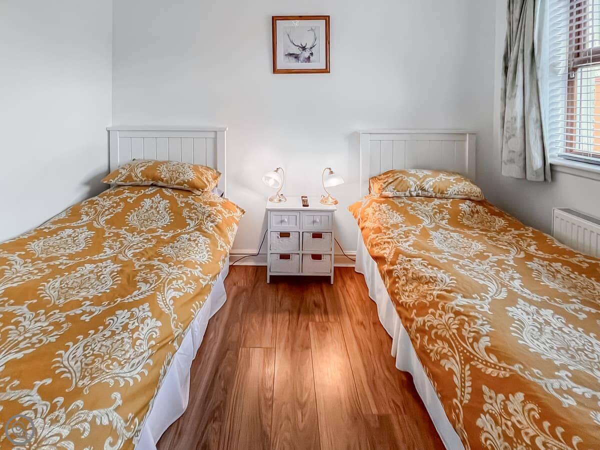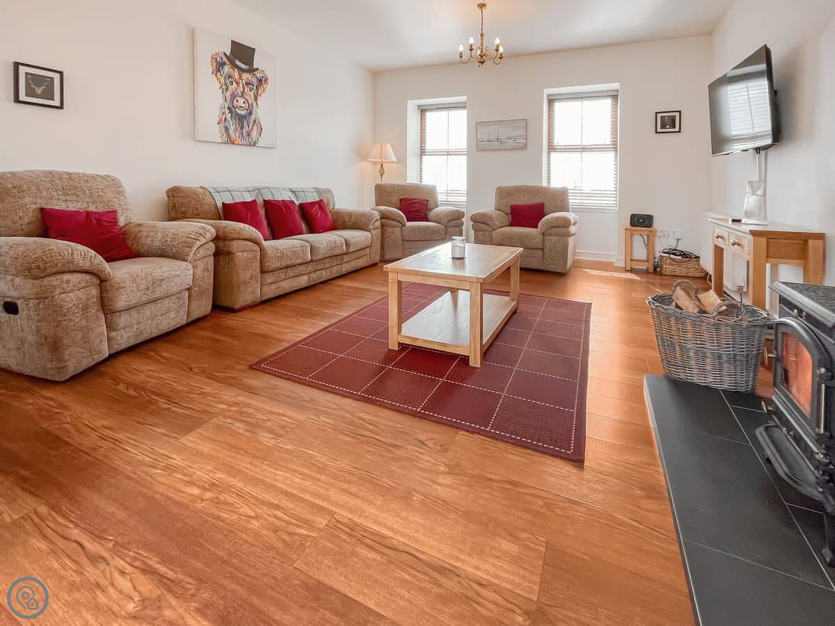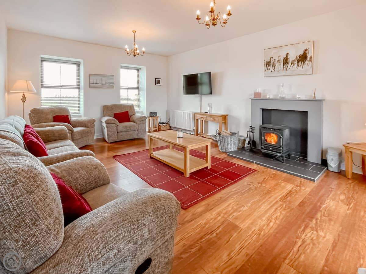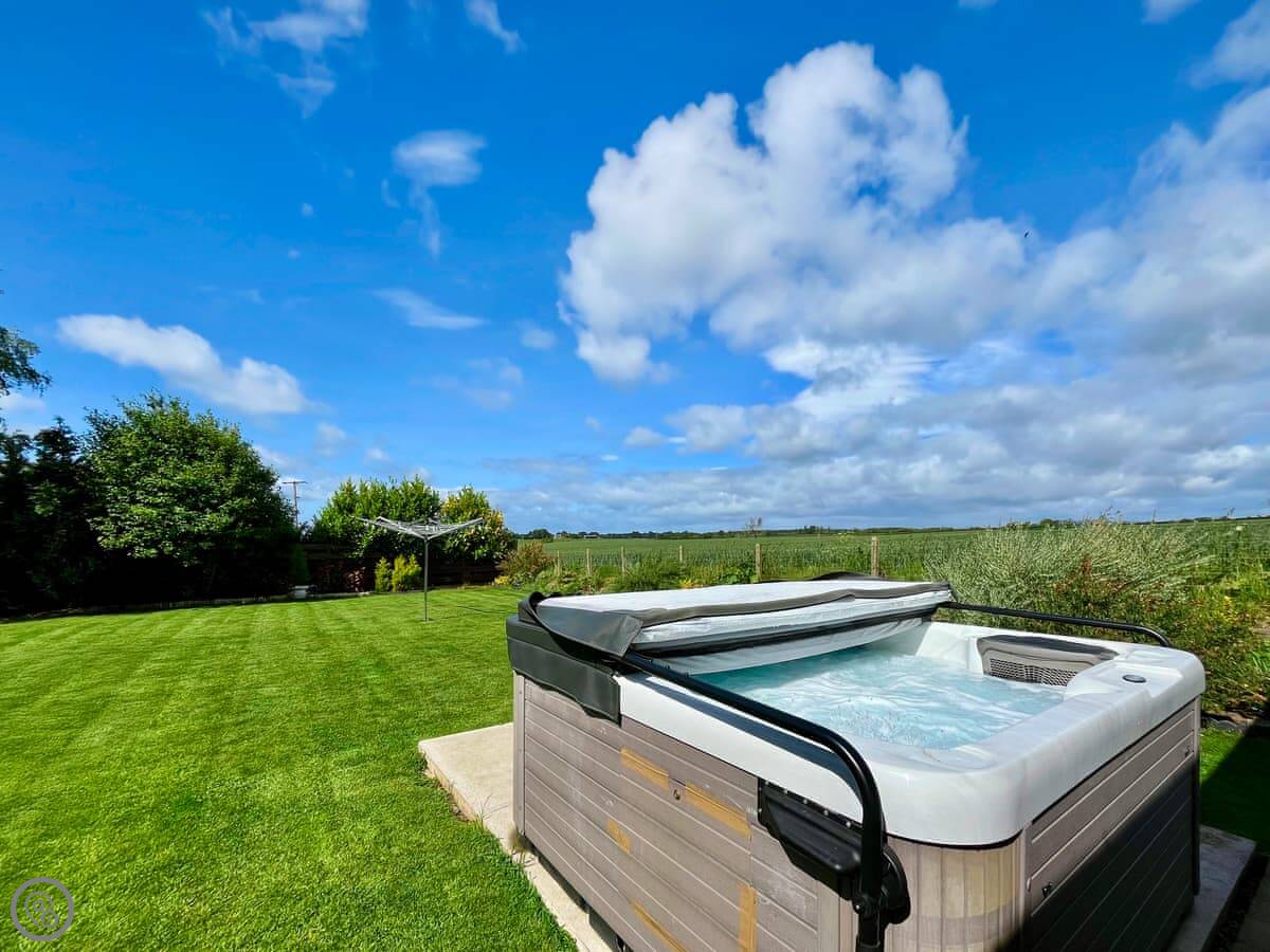 It sleeps six. Three bedrooms, two bathrooms. One bathroom has a separate bath and shower, the other is an en-suite with a shower. There's a wood burner in the living room. The garden is enclosed, which is useful if you've got dogs or kids. There's a hot tub.