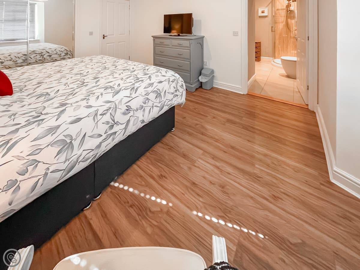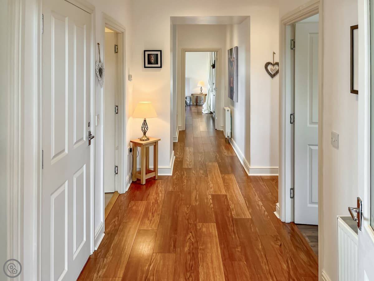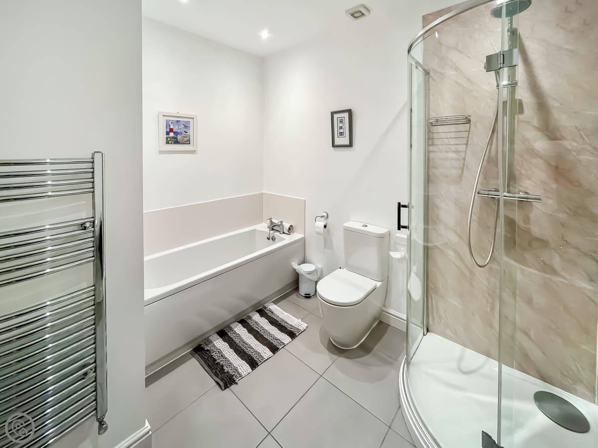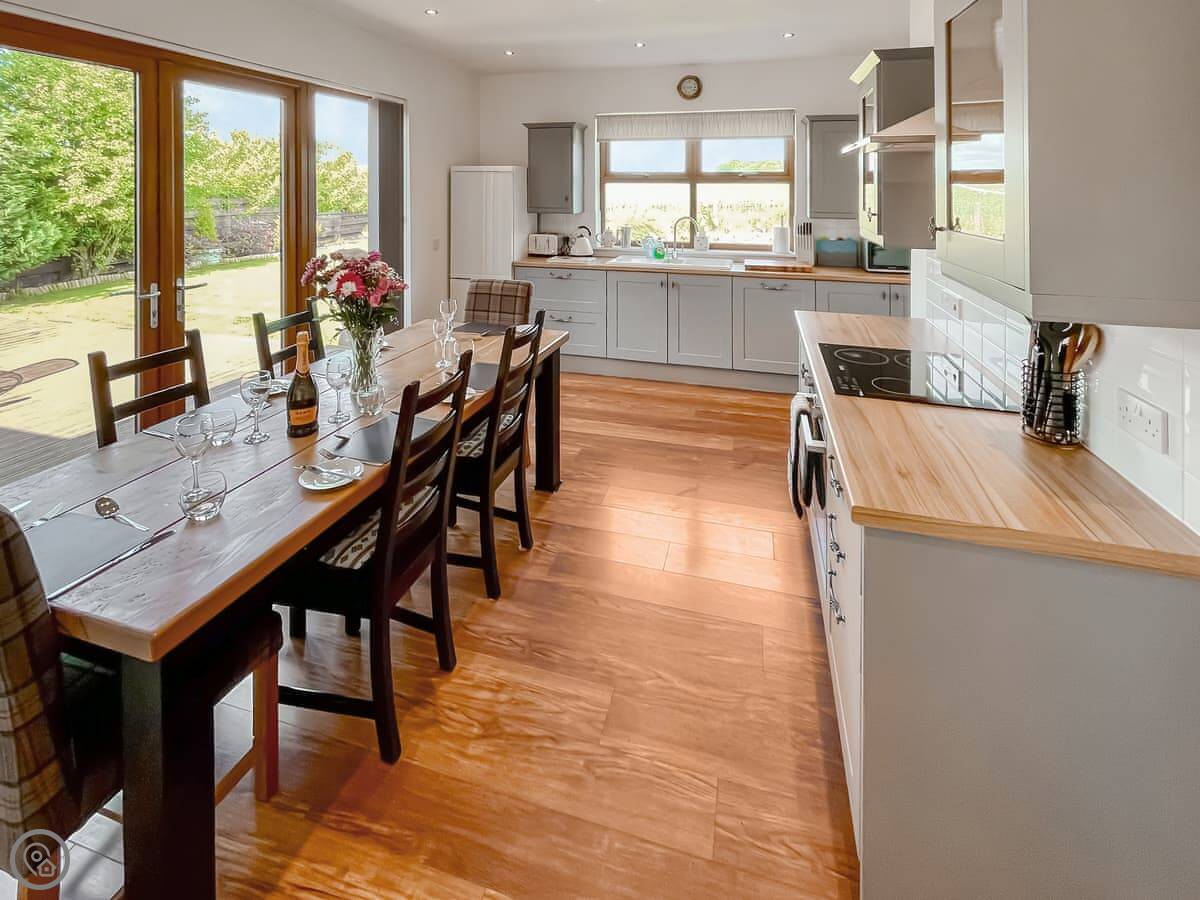 It sleeps six. Three bedrooms, two bathrooms. One bathroom has a separate bath and shower, the other is an en-suite with a shower. There's a wood burner in the living room. The garden is enclosed, which is useful if you've got dogs or kids. There's a hot tub.