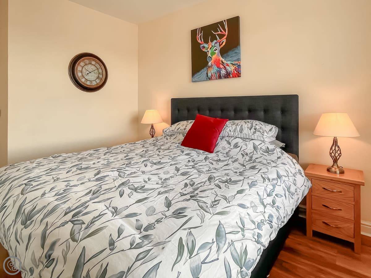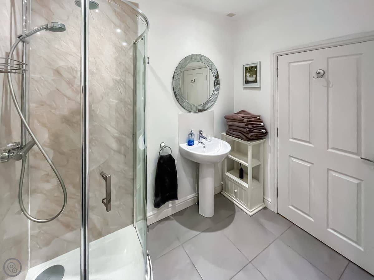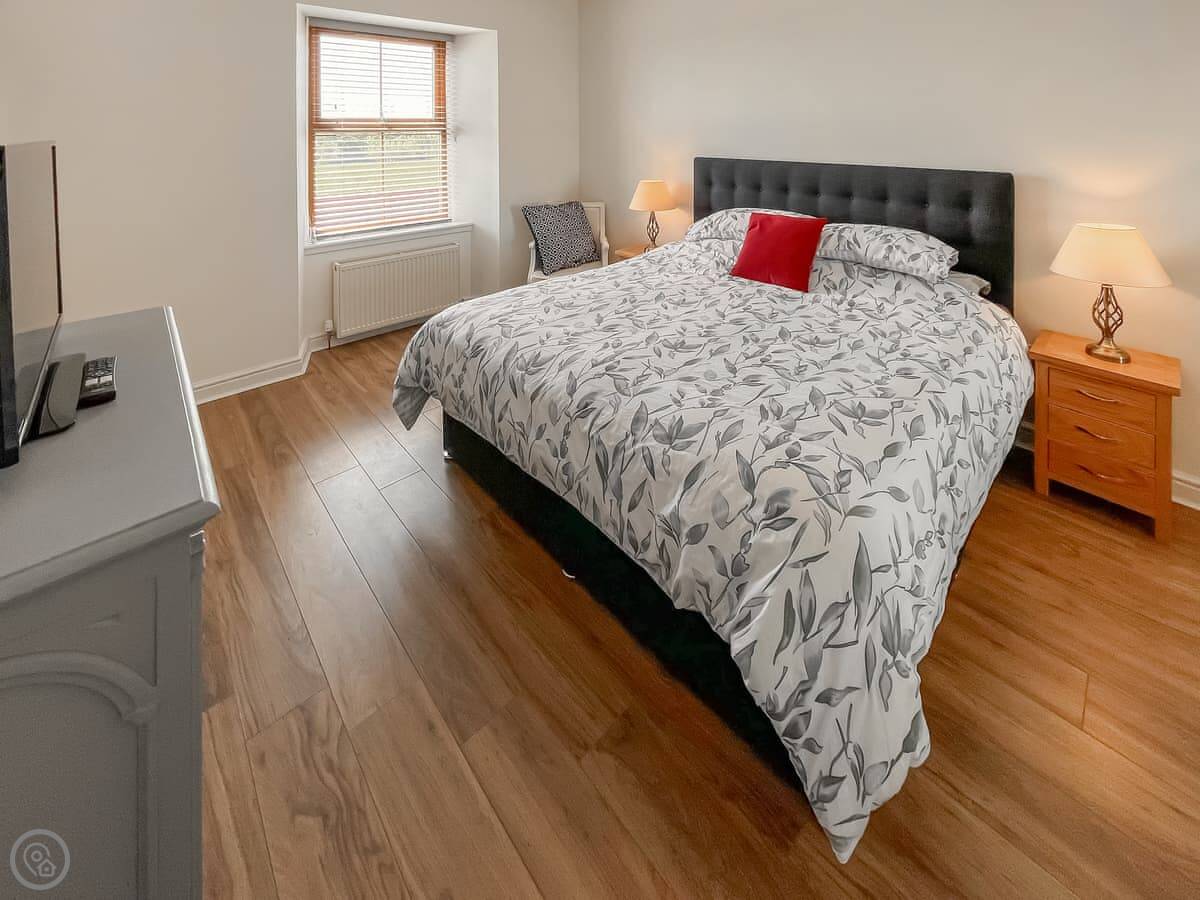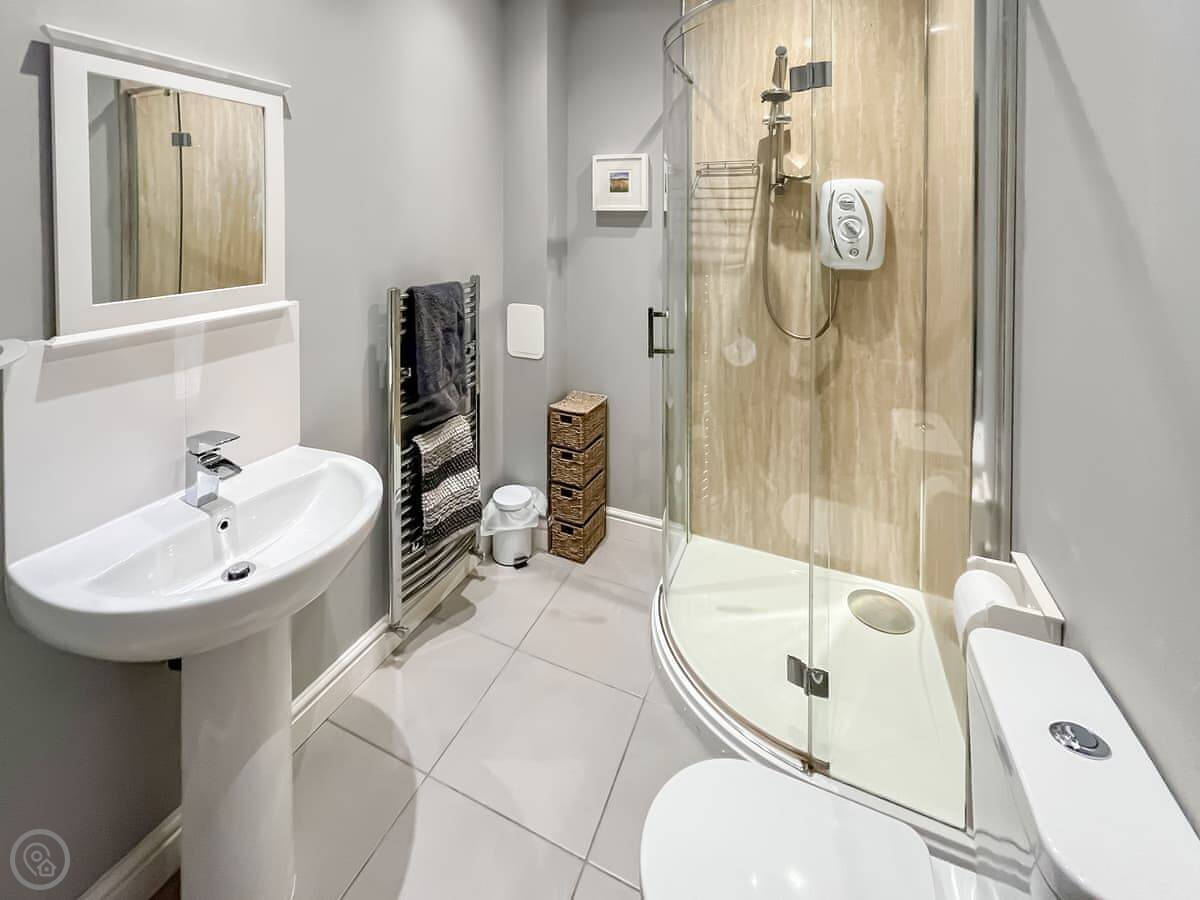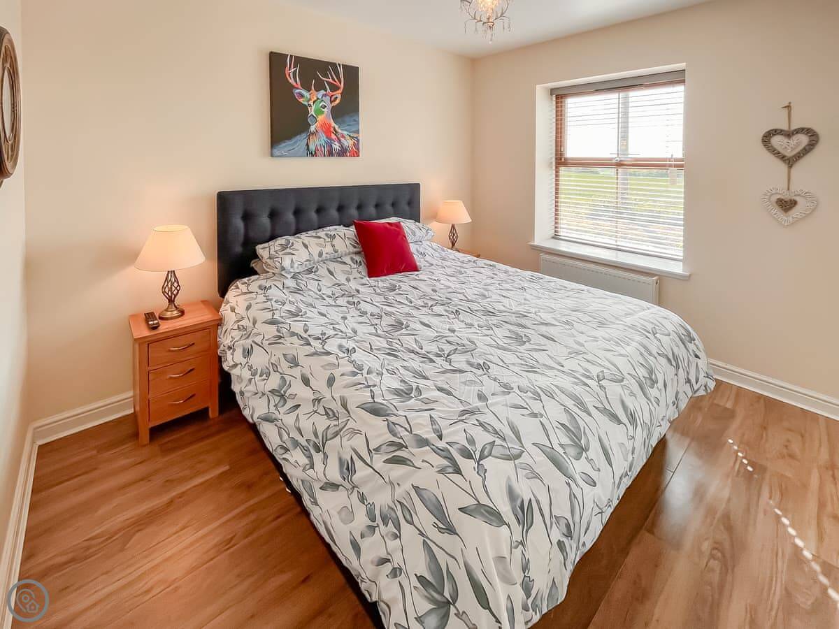 It sleeps six. Three bedrooms, two bathrooms. One bathroom has a separate bath and shower, the other is an en-suite with a shower. There's a wood burner in the living room. The garden is enclosed, which is useful if you've got dogs or kids. There's a hot tub.