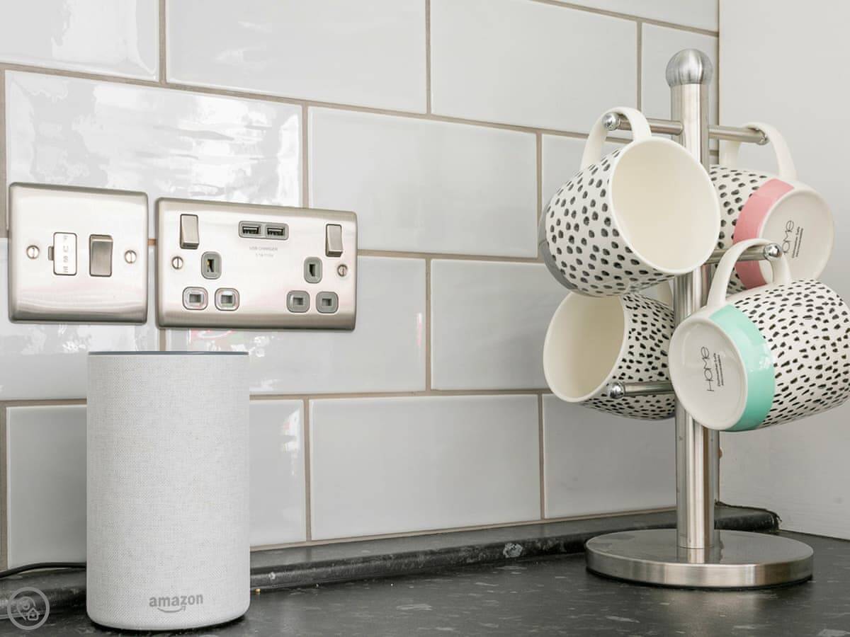 Inside, there's everything you need: a washing machine, dishwasher, WiFi, and the bedding and towels are included. There's a cot if you need it. The stairs are a typical terrace-house sort, straight up from the living room.