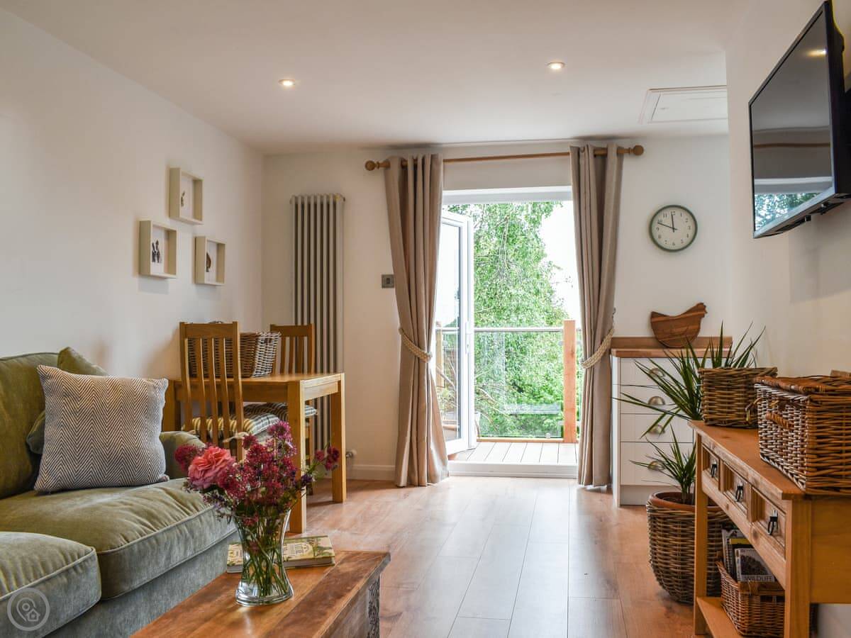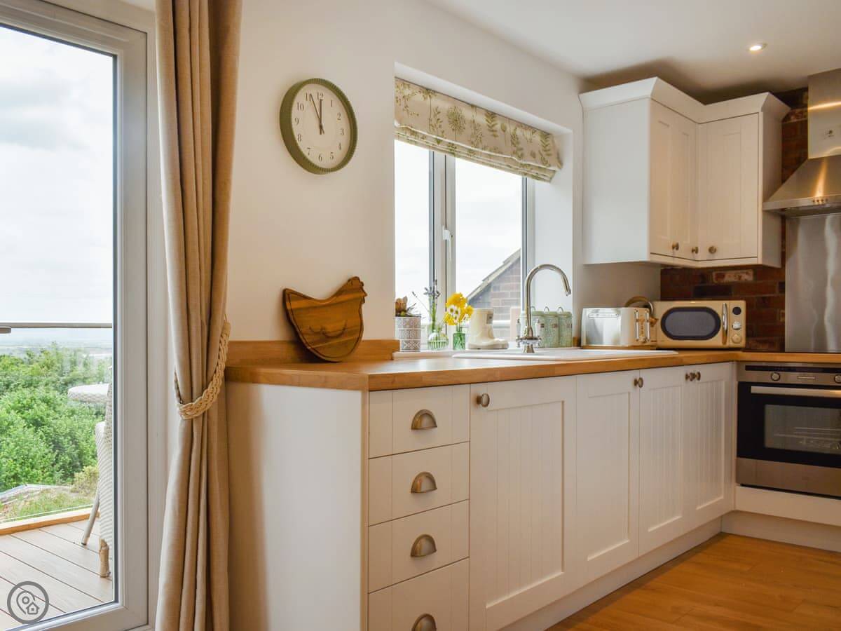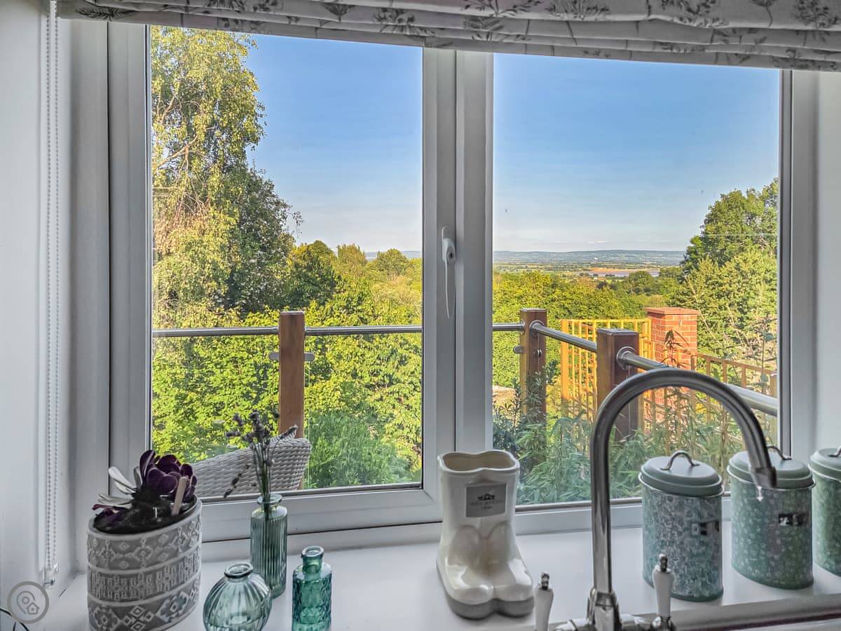 The main room is all open plan, kitchen, living area, dining table. It's light. There's a wood burner for cooler evenings and doors out to a glass-fronted balcony. The view from there is the best thing about the place. You can see right out over the Forest of Dean and the Severn.