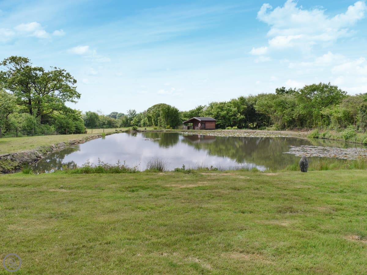 You have your own little patio area with a table. There's also four acres of grounds you can walk around, with a wildflower meadow and a small fishing lake. The hot tub is shared with the other cottage on site. There's a pitch and putt course too, if you fancy it.