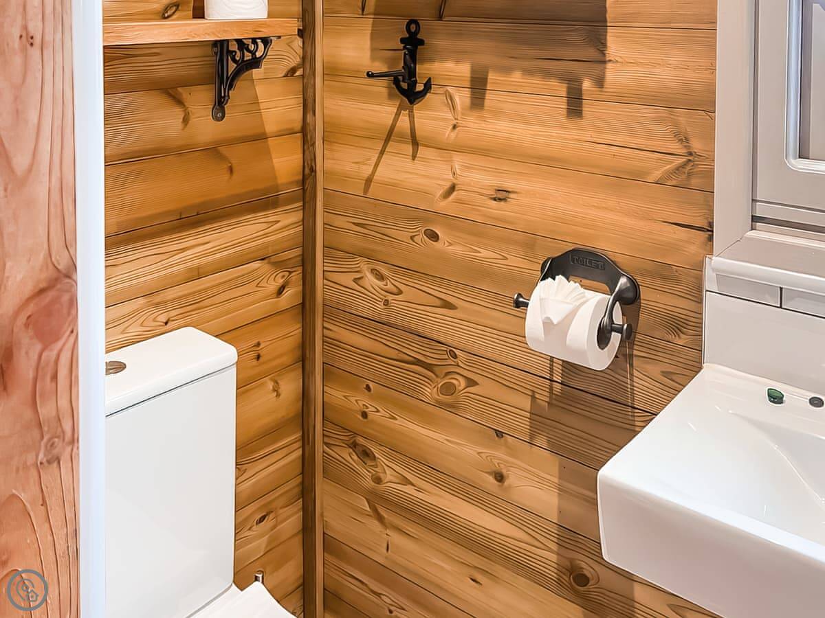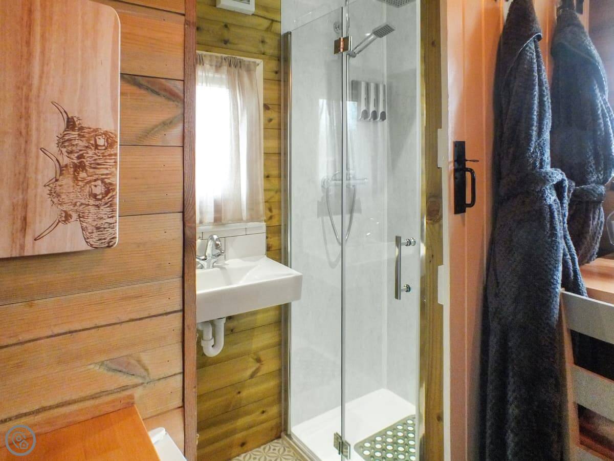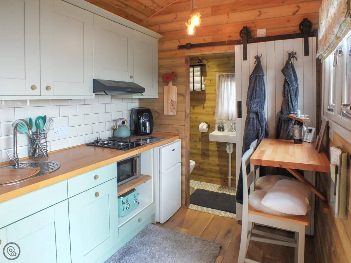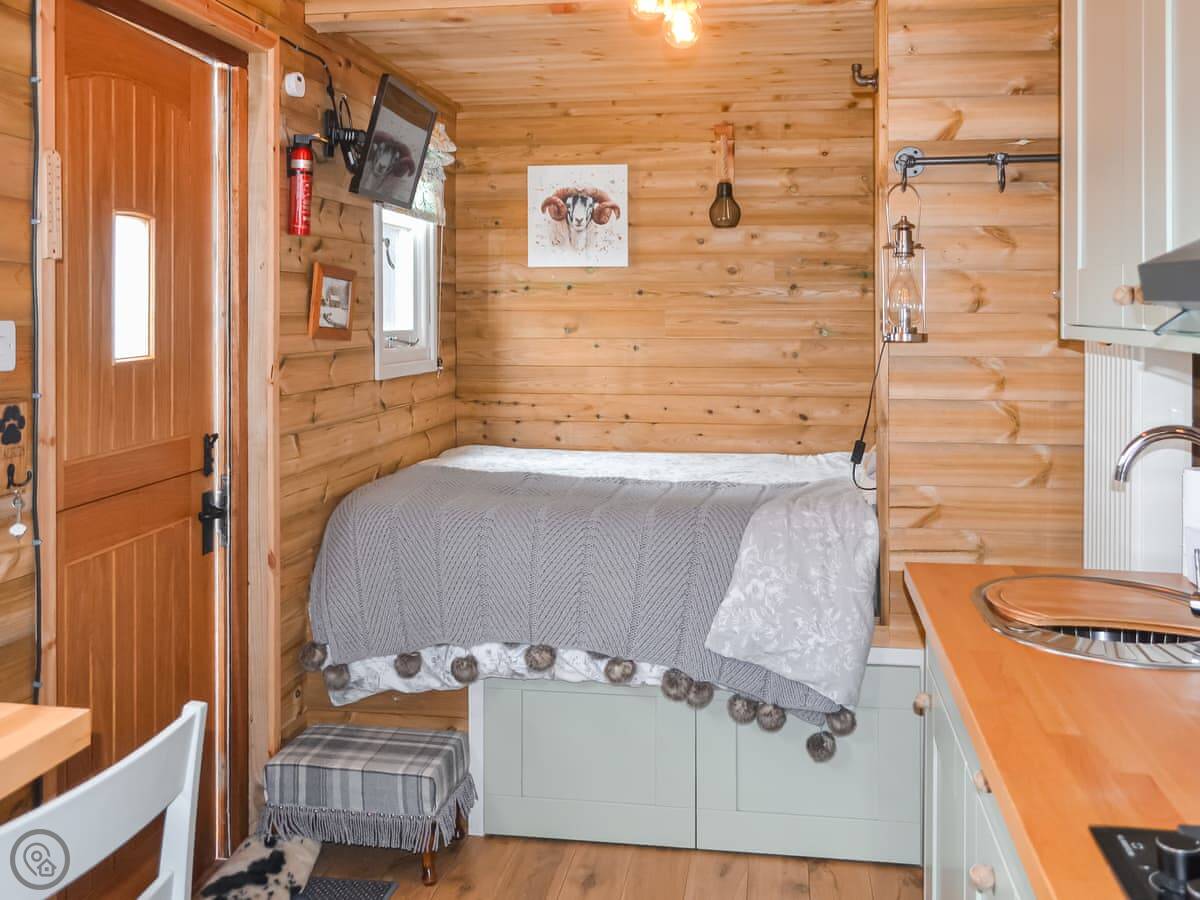 Inside, it's compact. There's a double bed, a small kitchen area, and a bathroom with a shower. There's seating for two. It's got WiFi and a TV.