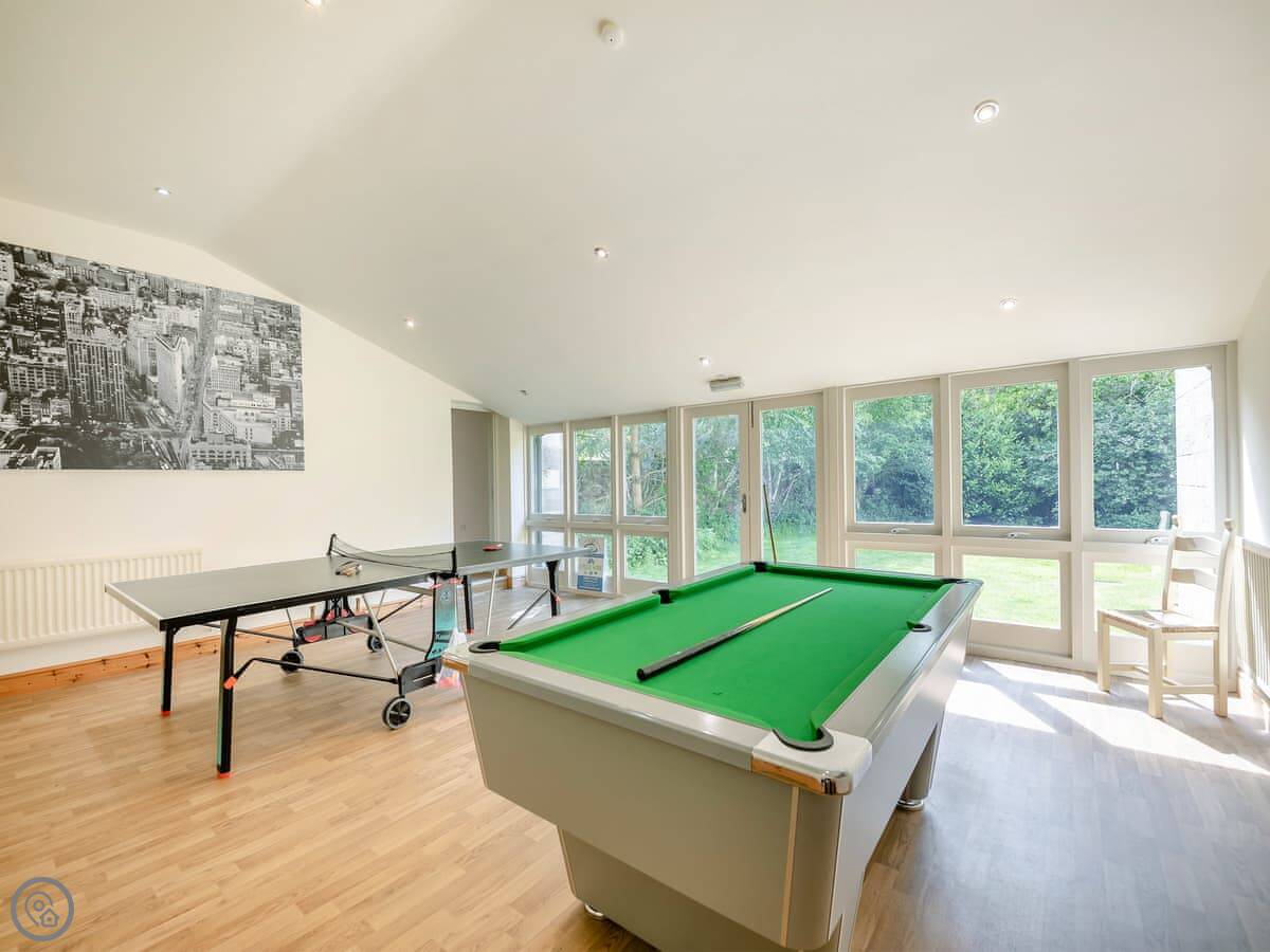 The main thing for kids, or really for anyone, is the separate games room. It's a big detached building with a huge TV, table football, and air hockey. Outside, there's a playground with swings and a slide, a trampoline, and a football area. There's also an indoor sports court with soft play, which is useful if the weather turns.