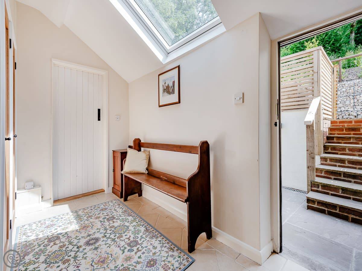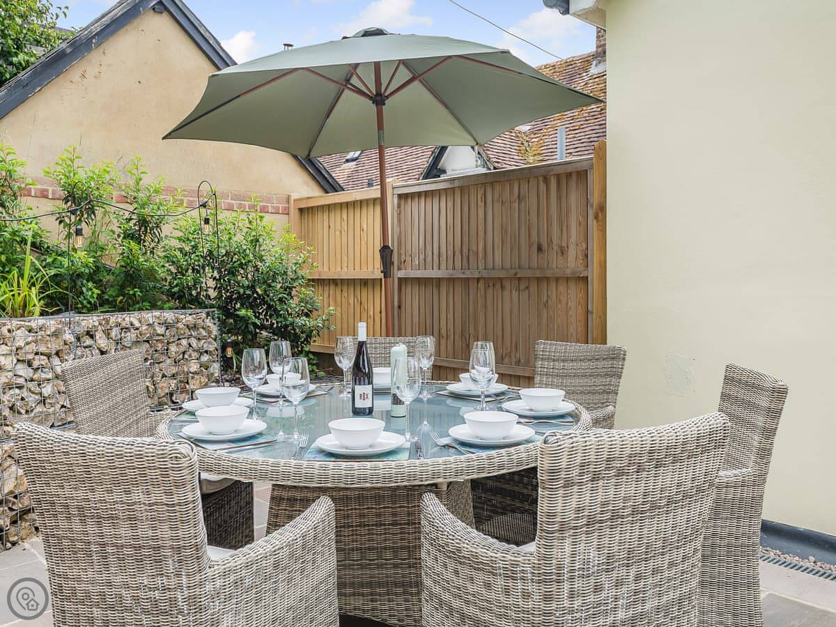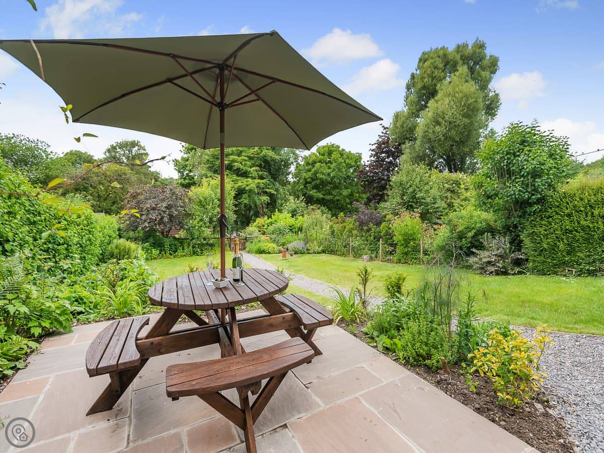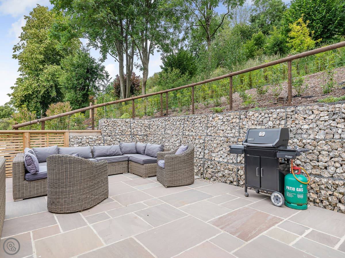 There's a patio area outside with a table, chairs, and a gas barbecue. The garden is enclosed, which is handy if you have dogs or children. You get a hot tub, which is set to one side overlooking the fields.