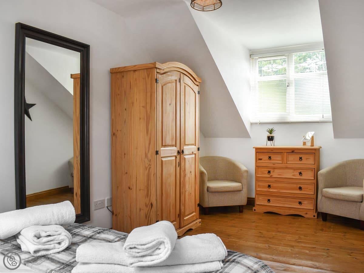Inside, it's open plan downstairs. The kitchen has a breakfast bar. The living area has two sofas and a dining table. There's a separate toilet there too. Upstairs, the main bedroom is a good size with a double bed. The second room has a single bed. The bathroom has a bath with a shower over it.