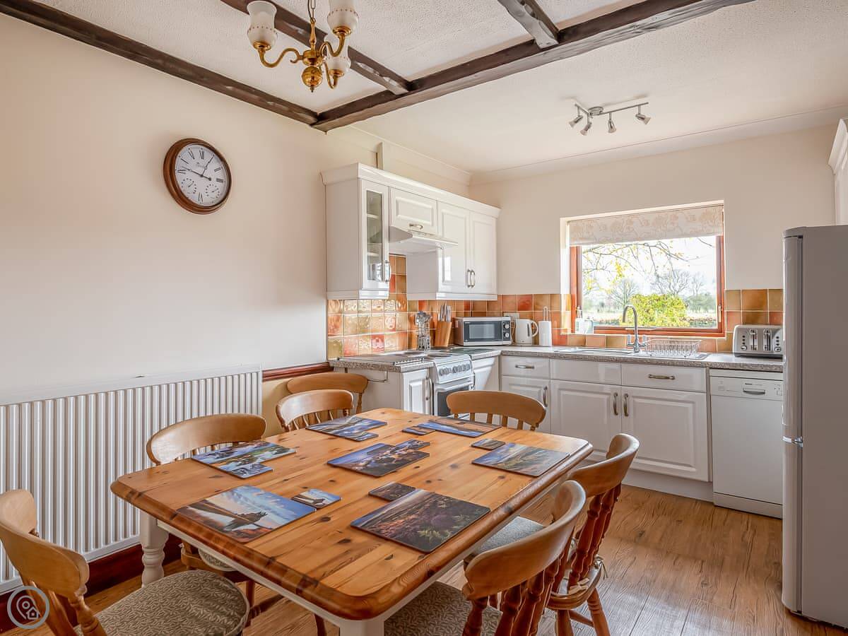 The living room has a stone fireplace and exposed beams. The view from the kitchen looks out over the fields. You'll see sheep and cows.