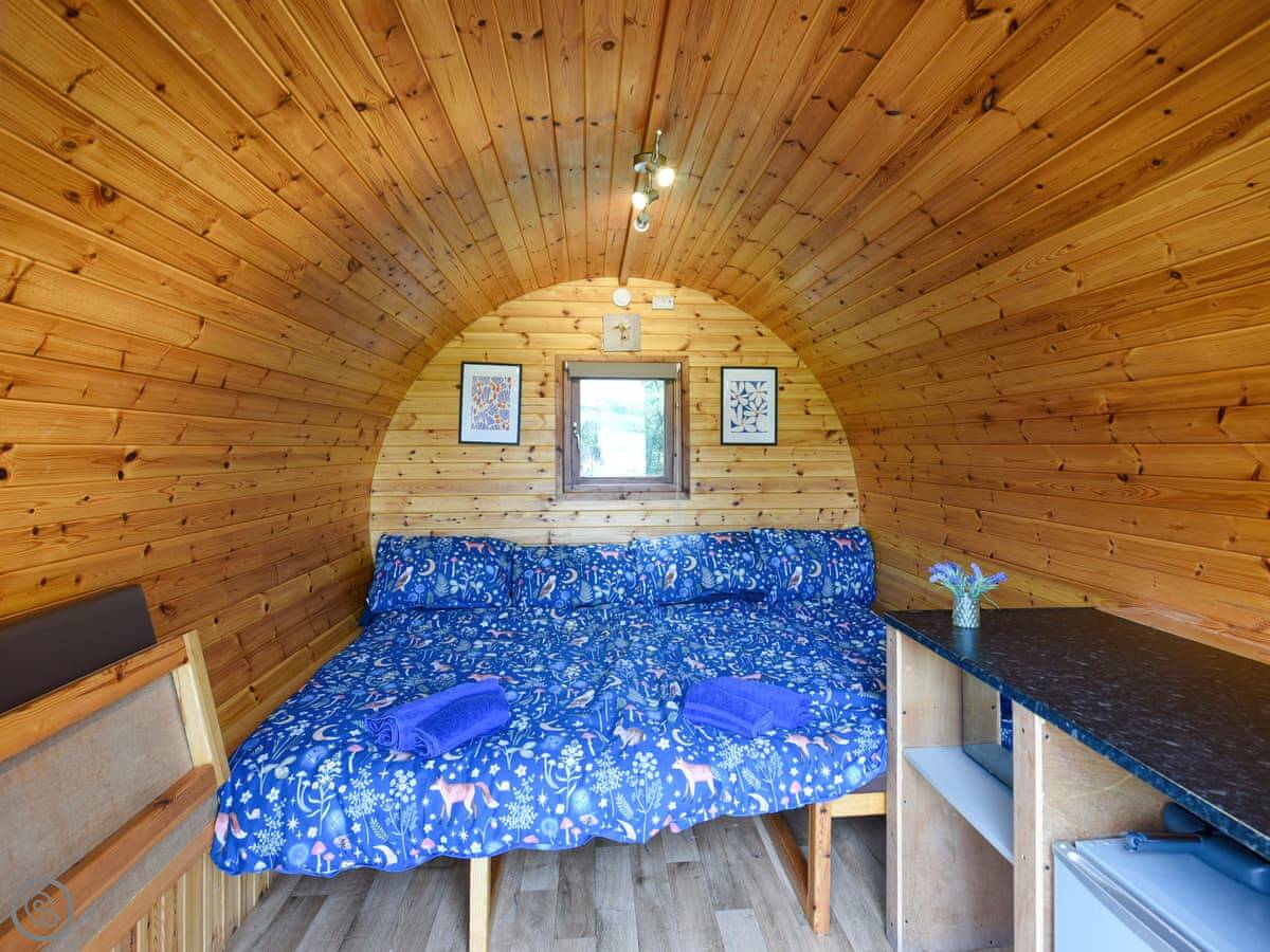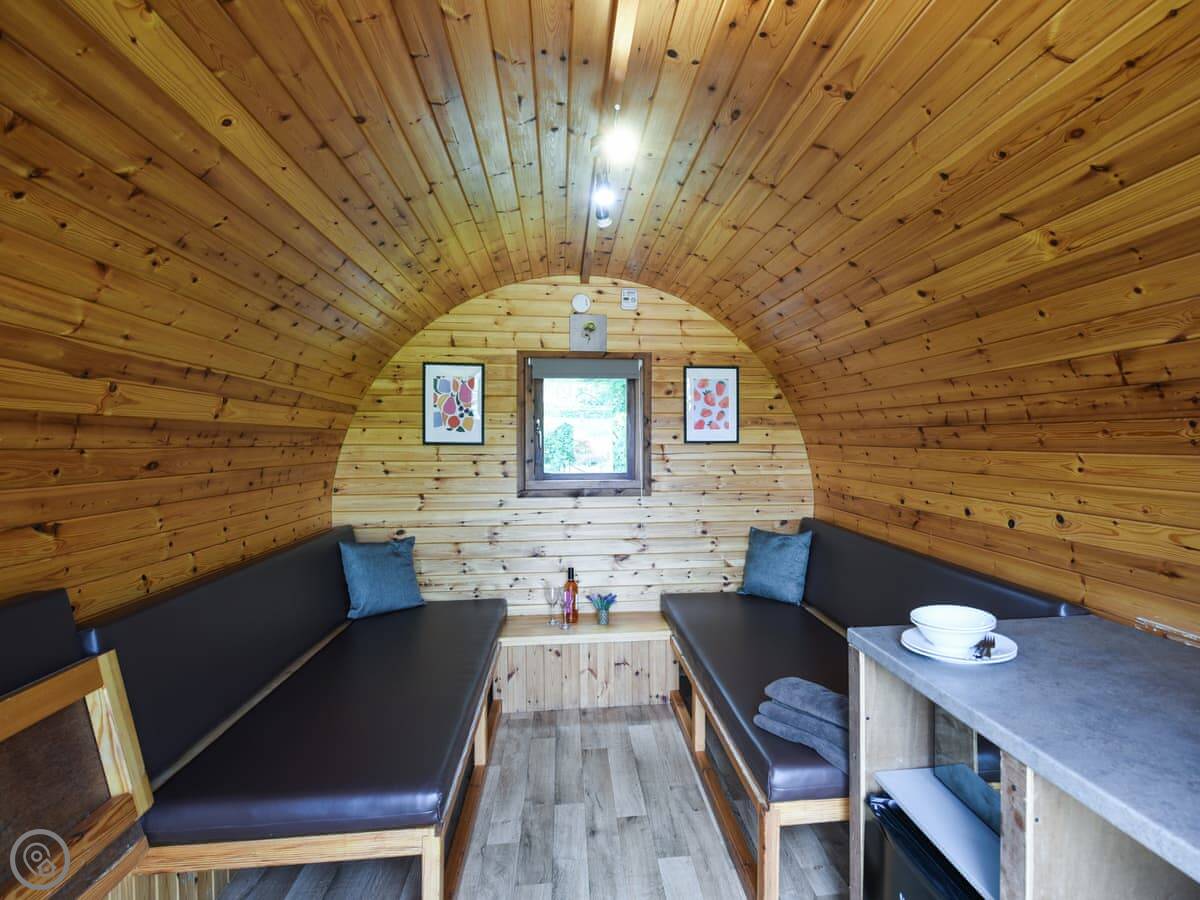 Oak Pod is on our farm in Dudleston, Shropshire. It's a wooden glamping pod for two people. One main room with a seating area that converts into the bed. You can have it as two singles or one big double.