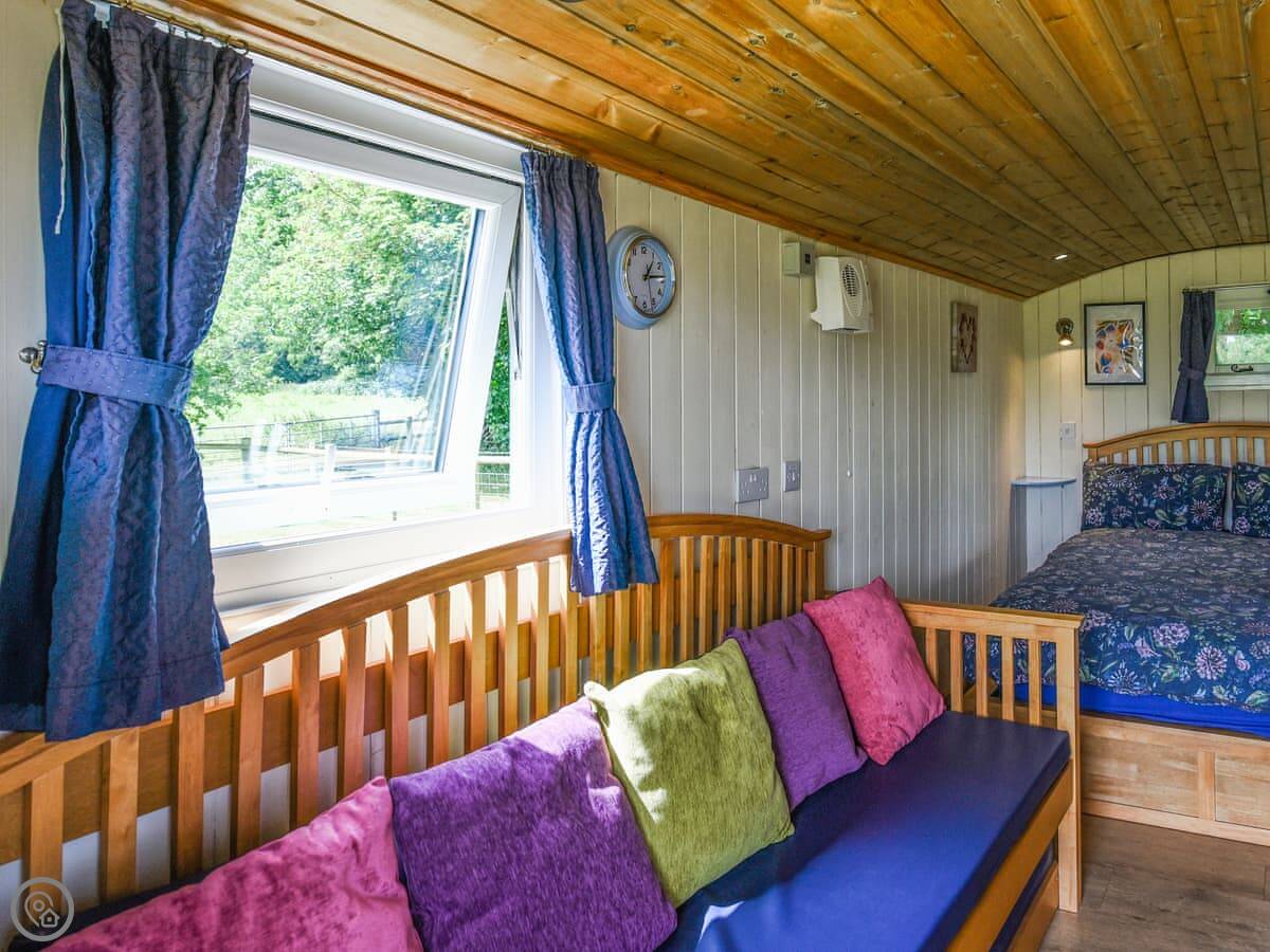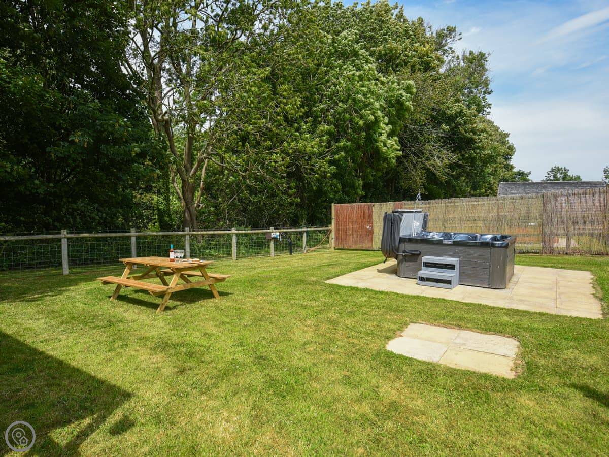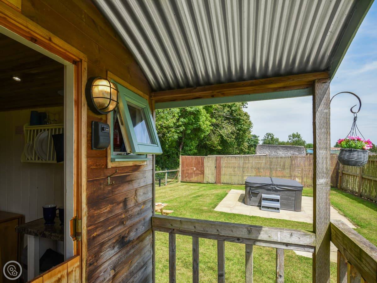 This is Bluebell, our Shepherd's Hut. It's on our land in Dudleston, near Ellesmere. It's detached and has its own little deck with a hot tub.
