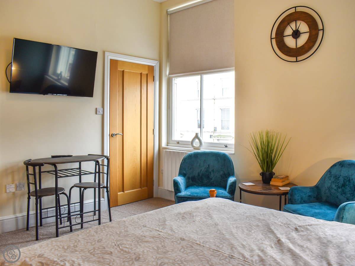 Denelea Studio 1 is a studio flat on the first floor of a Victorian townhouse in Scarborough. It's for two people. There's one room with a kingsize bed, a small table and chairs, and a TV. The kitchen area is compact, more for snacks or a simple breakfast than cooking a big meal. There's an en-suite bathroom with a bath and shower over it.