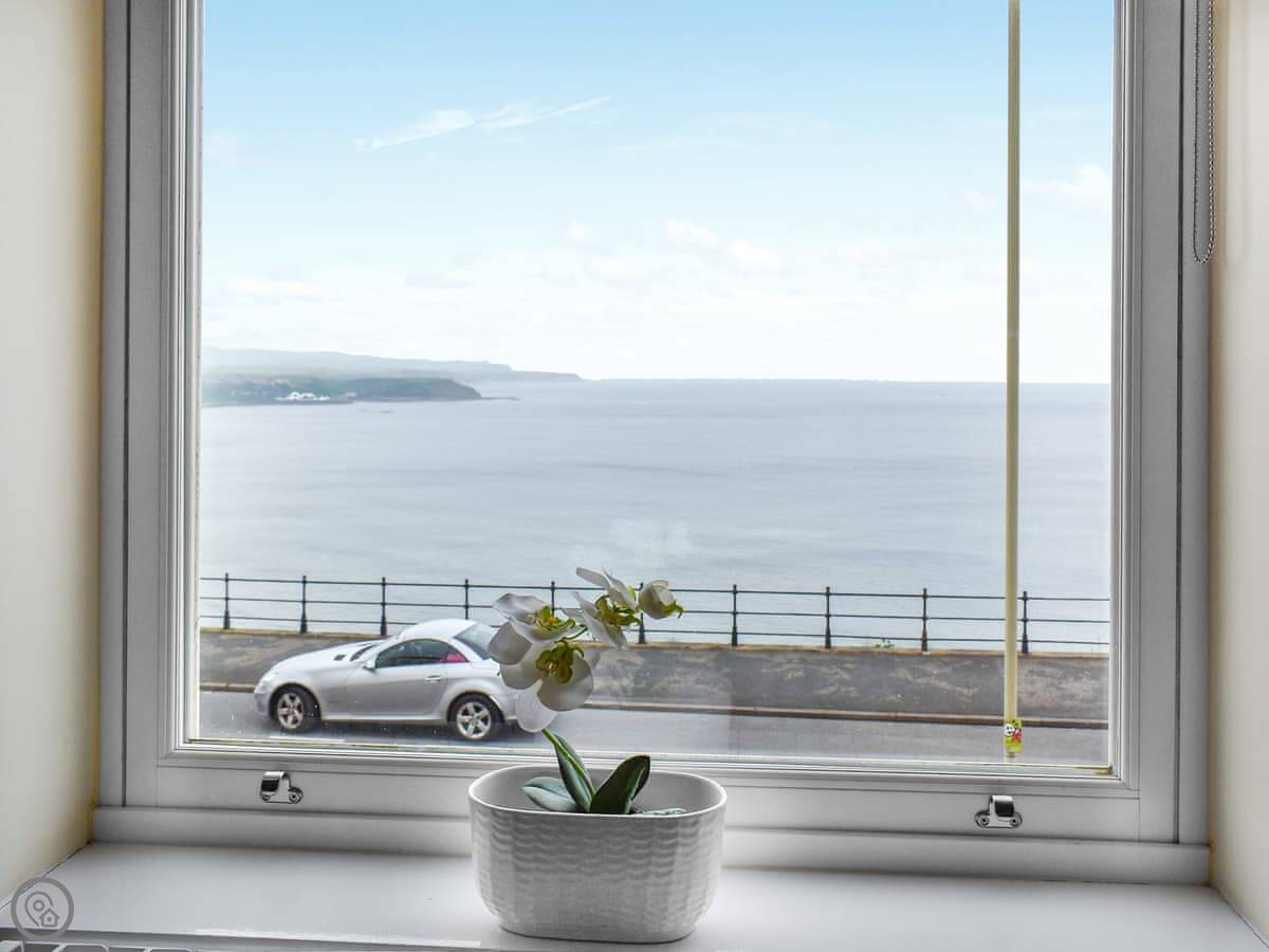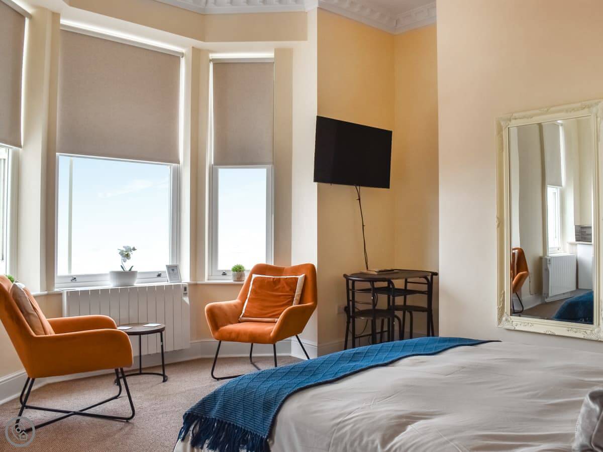Denelea Studio 2 is a one-bed apartment on the first floor of an old townhouse in Scarborough. It sleeps two. The main thing about it is the view. There's a big bay window with two chairs you can sit in and look out over the town and the sea. You can see a lot from up there.