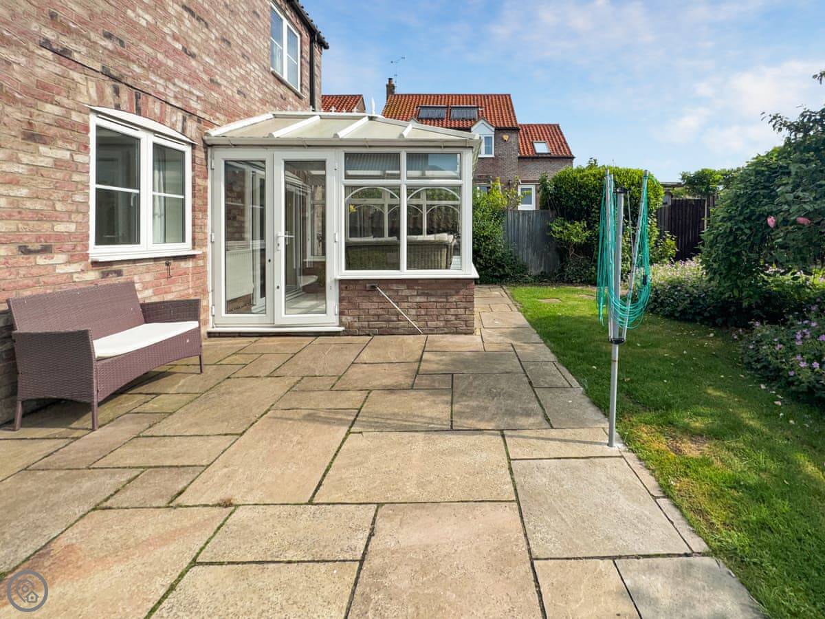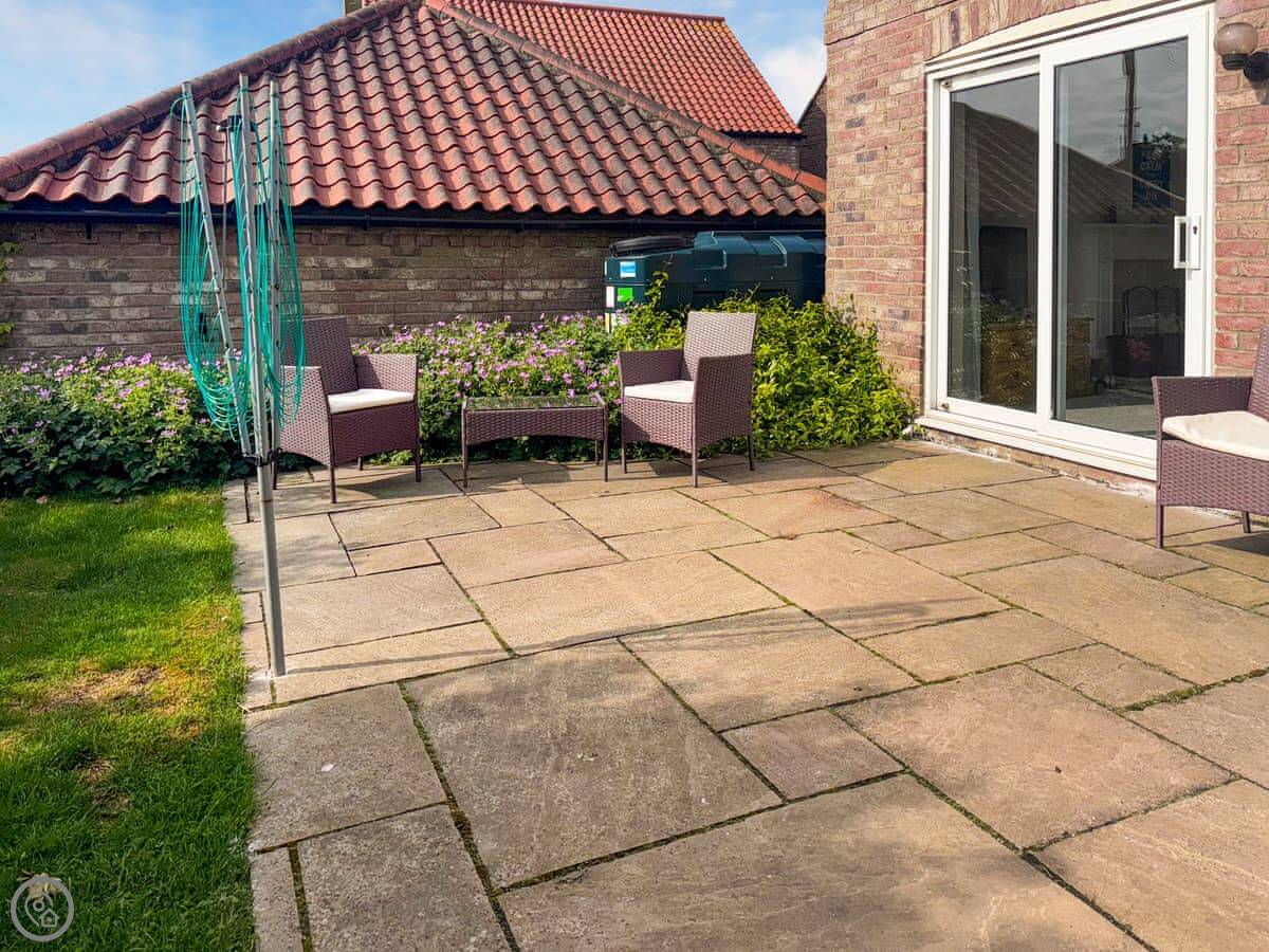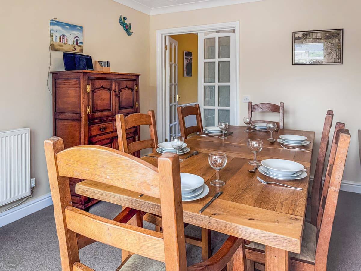 Downstairs, there's a sitting room with an open fire, a dining room that seats eight, and a conservatory. The garden is enclosed, mostly lawn with a patio. There's an outside tap. You can bring two dogs.