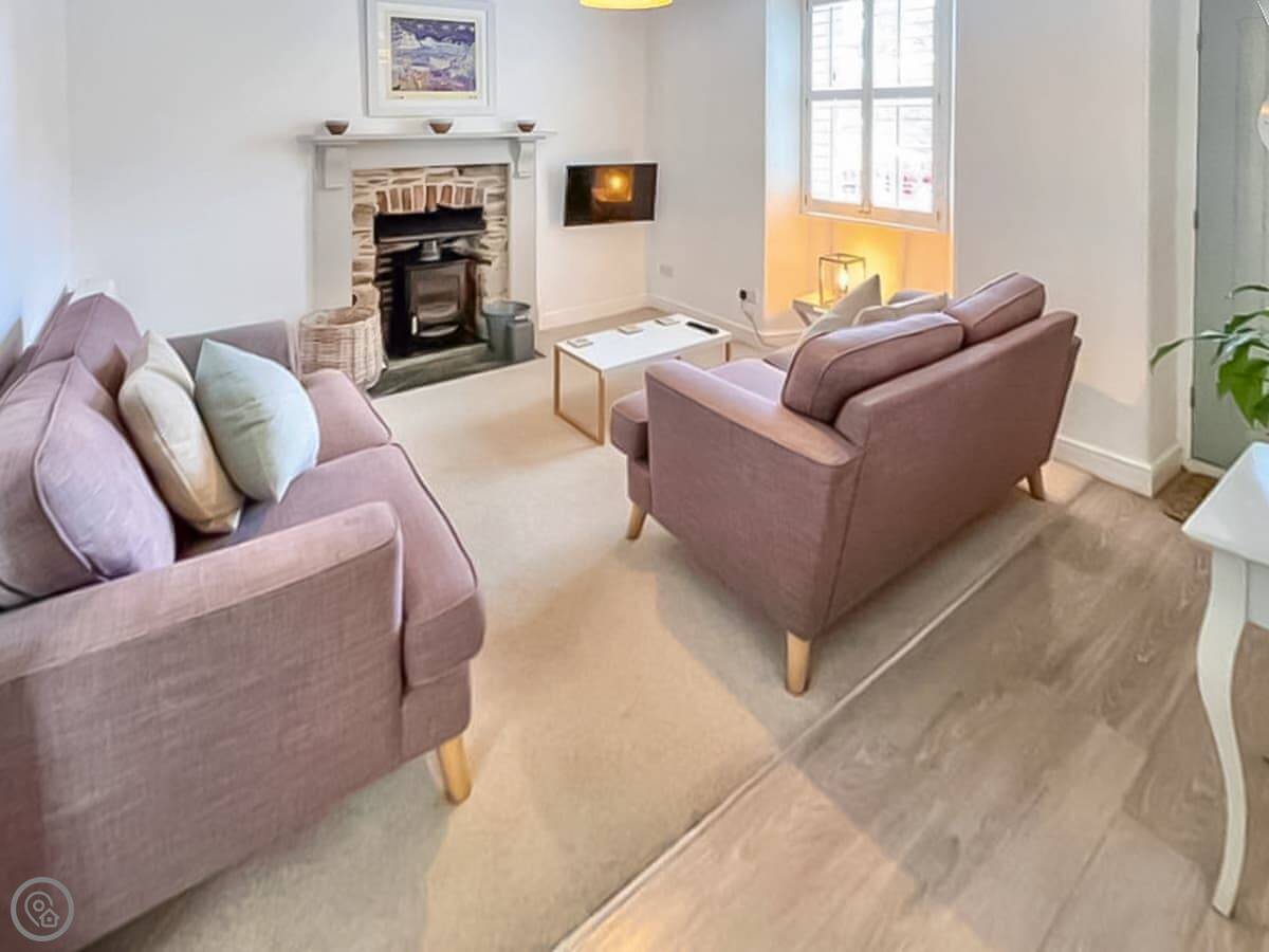 There's a living room at the front with a wood burner. The kitchen is through a stone archway from there. Outside, there's a sitting area at the front of the cottage.