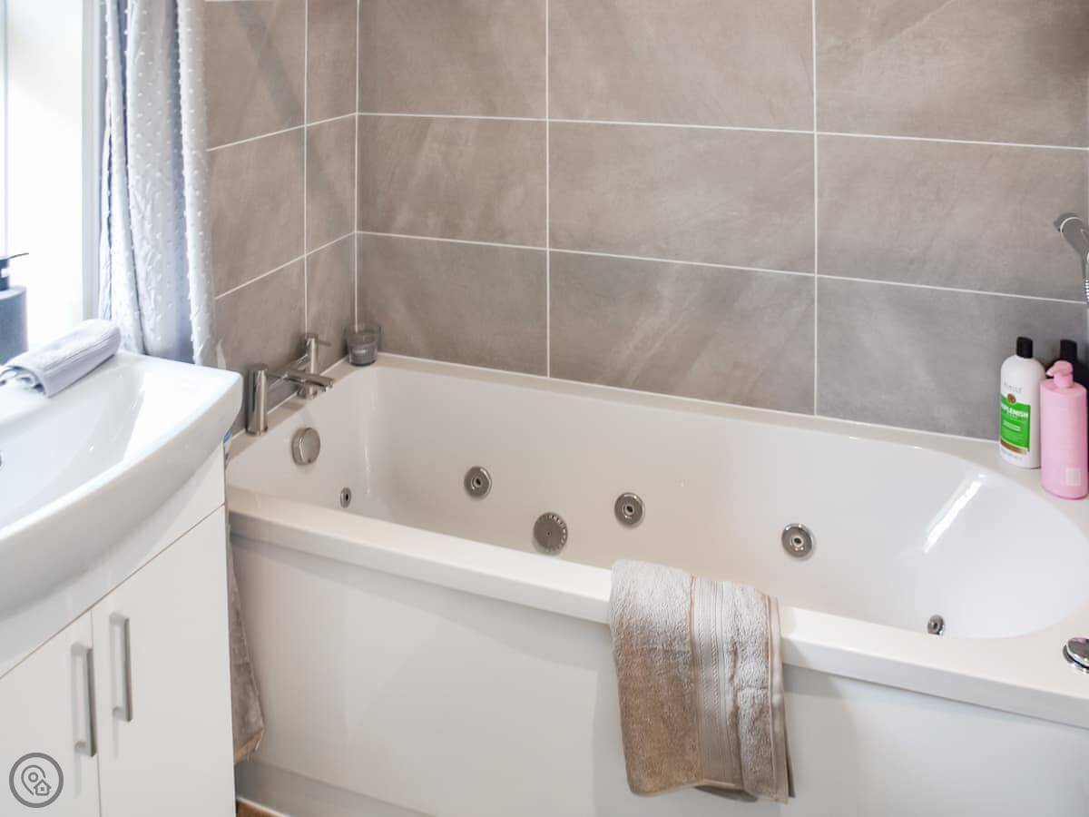 There's one bathroom. It has a jacuzzi bath with a shower overhead. The garden is enclosed at the back. It's a decent size with a lawn, so it's safe for kids and dogs. You can get three cars off the road on the drive.