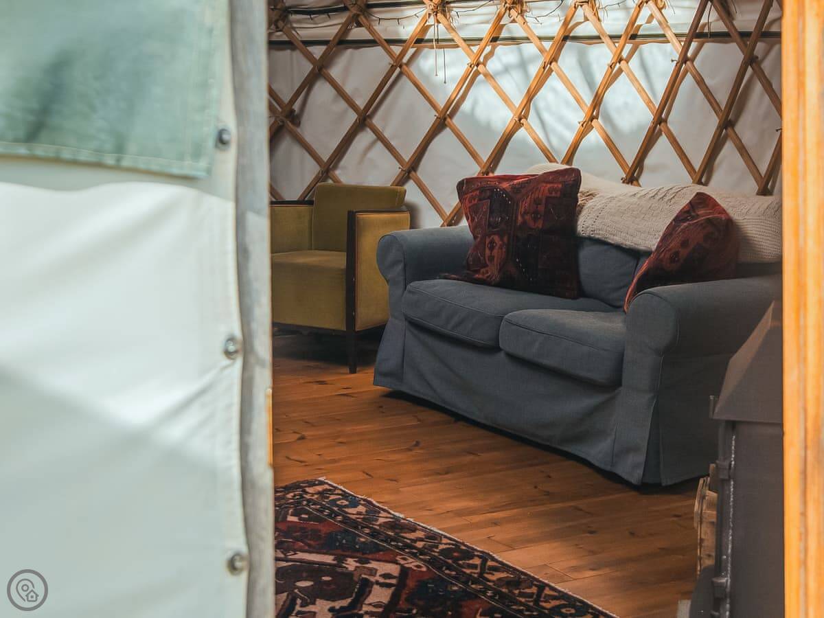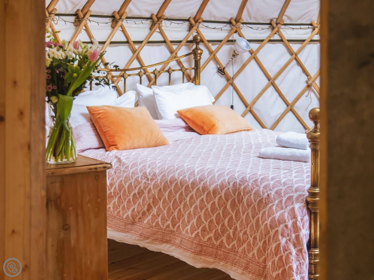 You've got the deck and the bit of garden around the yurt to yourself. There's a firepit and chairs. The view looks out over our fields and down to one of the lakes. The yurt has a wood burner and a window in the roof so you can see the stars from bed.