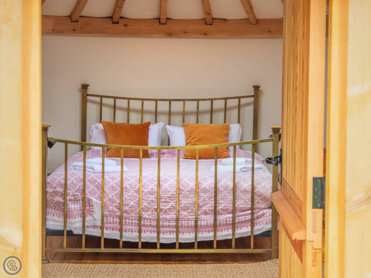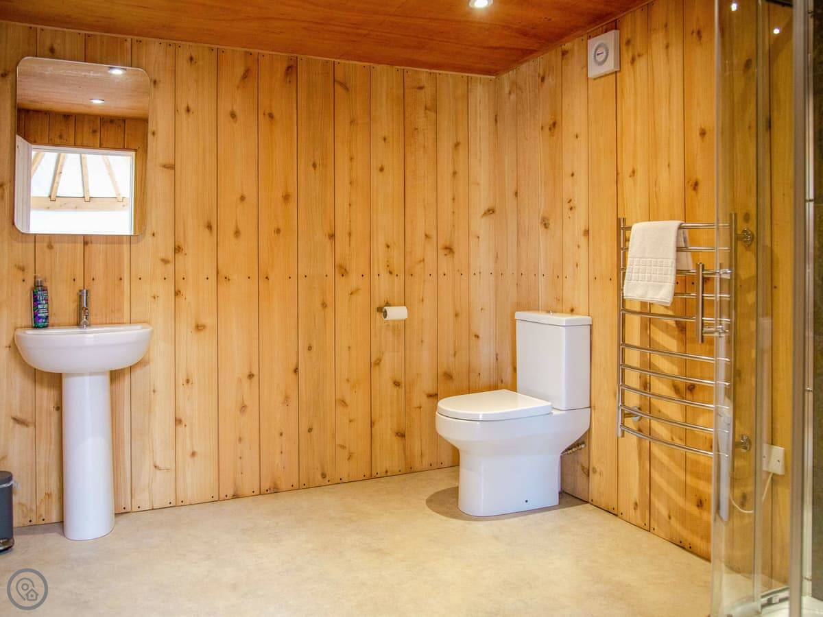 This is the Roundhouse at Walnut Farm. It's a modern, circular building built for the views. The big draw is the roof window over the main bed. You can lie there and look at the stars. It's a proper bed with a wood burner in the room too.