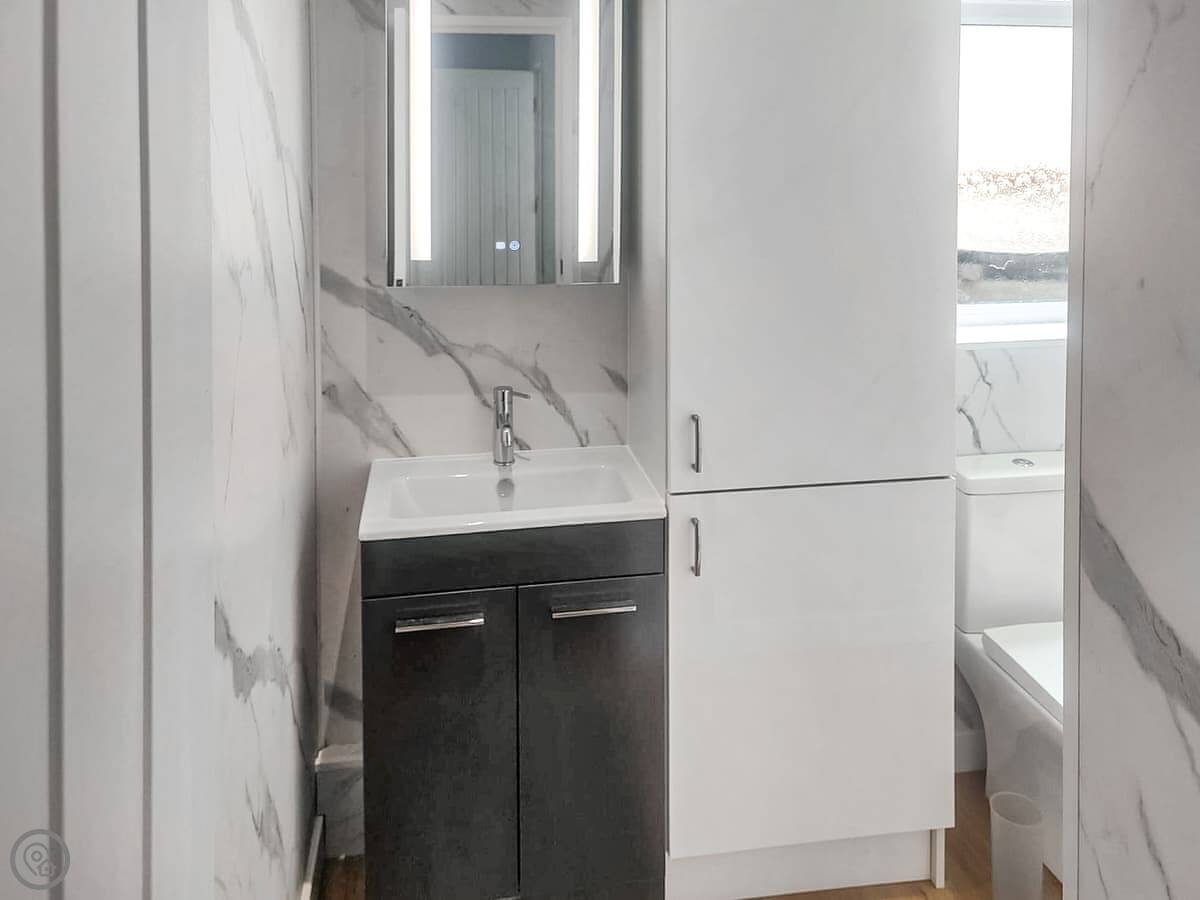 It's a 4 Star place, sleeps four. Two bedrooms, two bathrooms. One's an en-suite shower room off the main bedroom. The second bathroom has a bath with a shower over it. The other bedroom has two single beds.