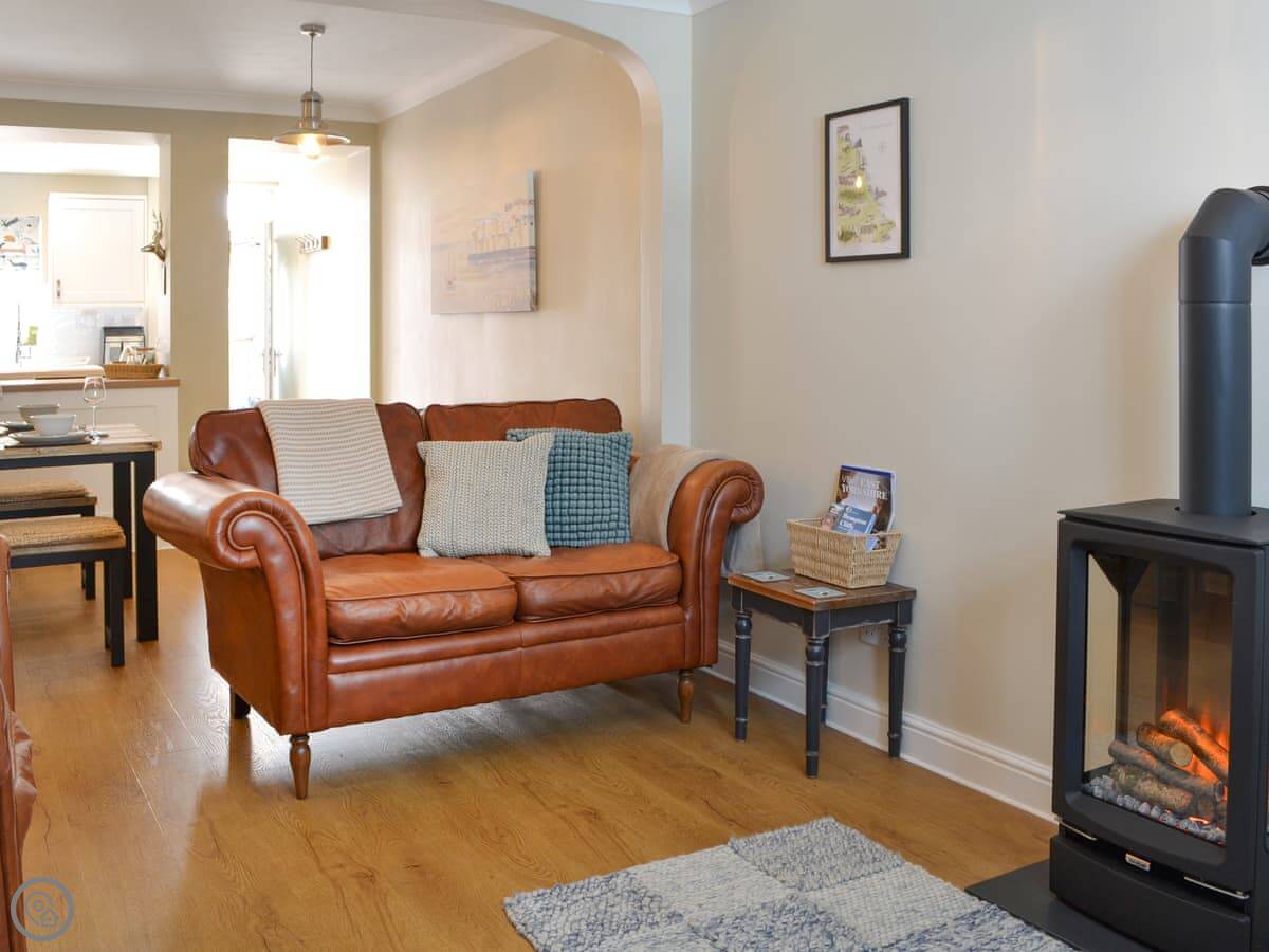 It's got a 4 Star rating. It's clean, modern, and warm. The layout is open plan downstairs. You've got a sofa, a dining table, and a kitchen with an induction hob, oven, dishwasher, and an air fryer. The stove is electric but looks like a log burner.