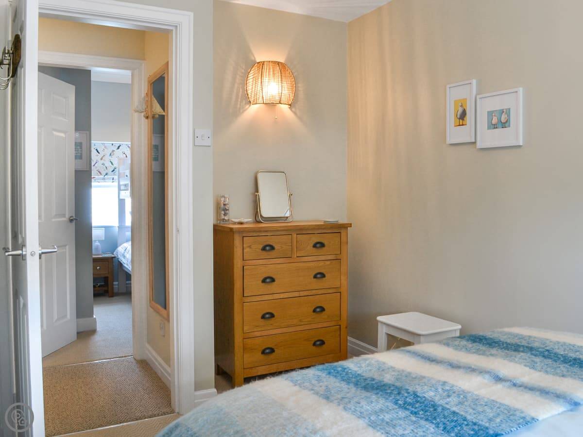 Upstairs there's a double bedroom and a bunk room. The bathroom has a shower. The stairs are a typical cottage staircase, so they're a bit steep and turn at the top.
