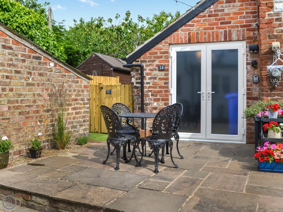 Outside is a small enclosed patio area with seating. It's secure for dogs. There's storage round the side for bikes or surfboards.