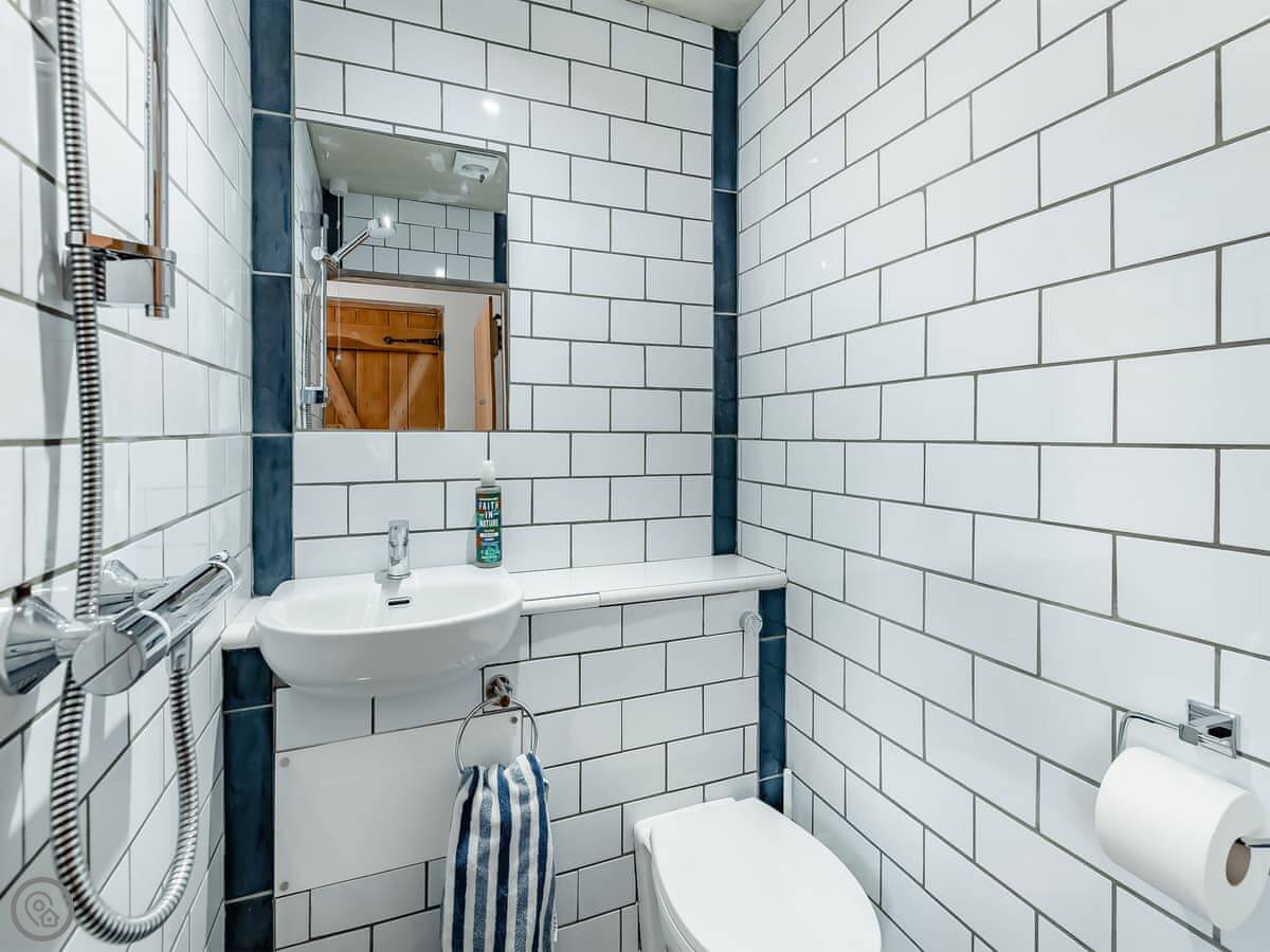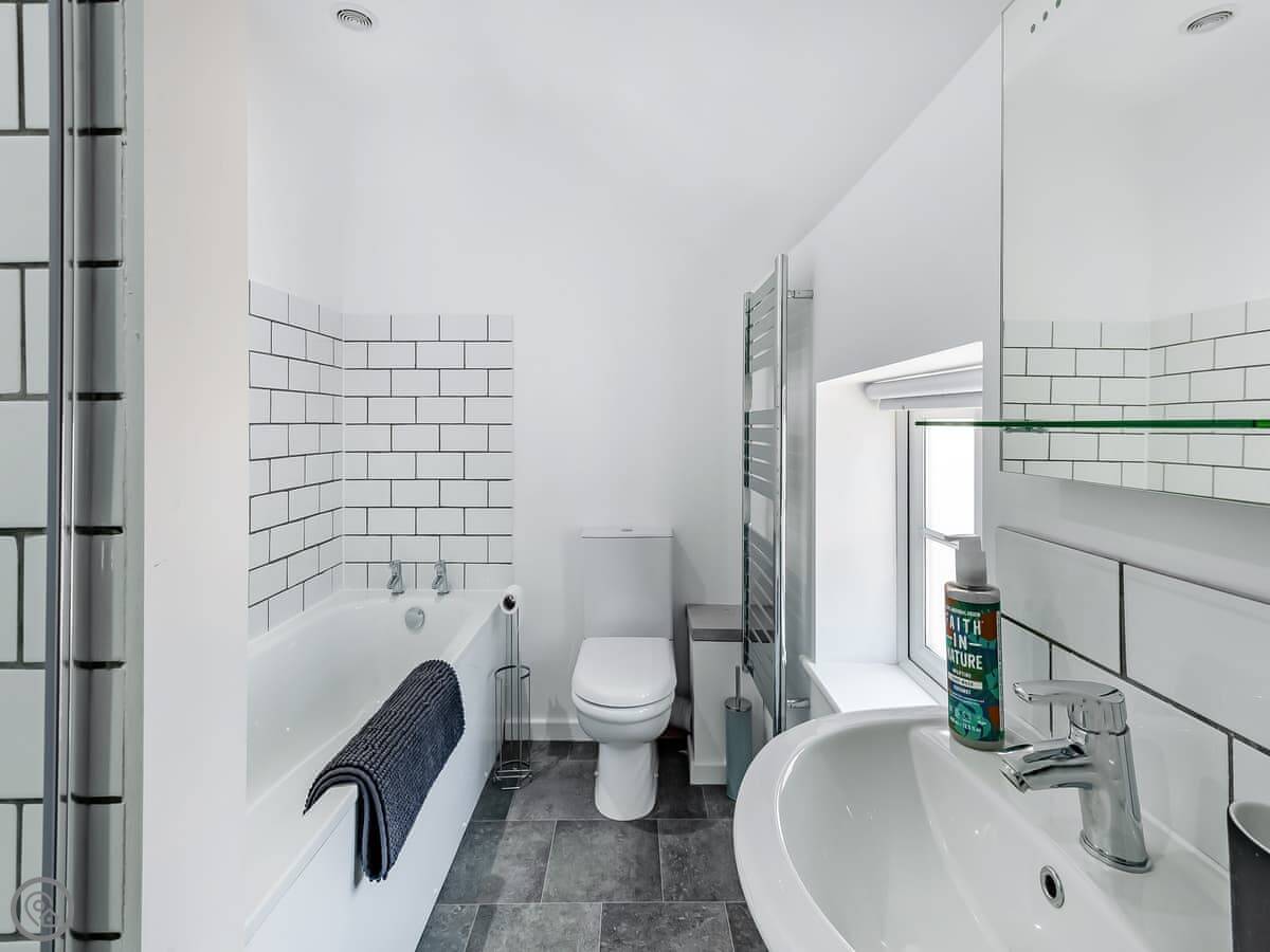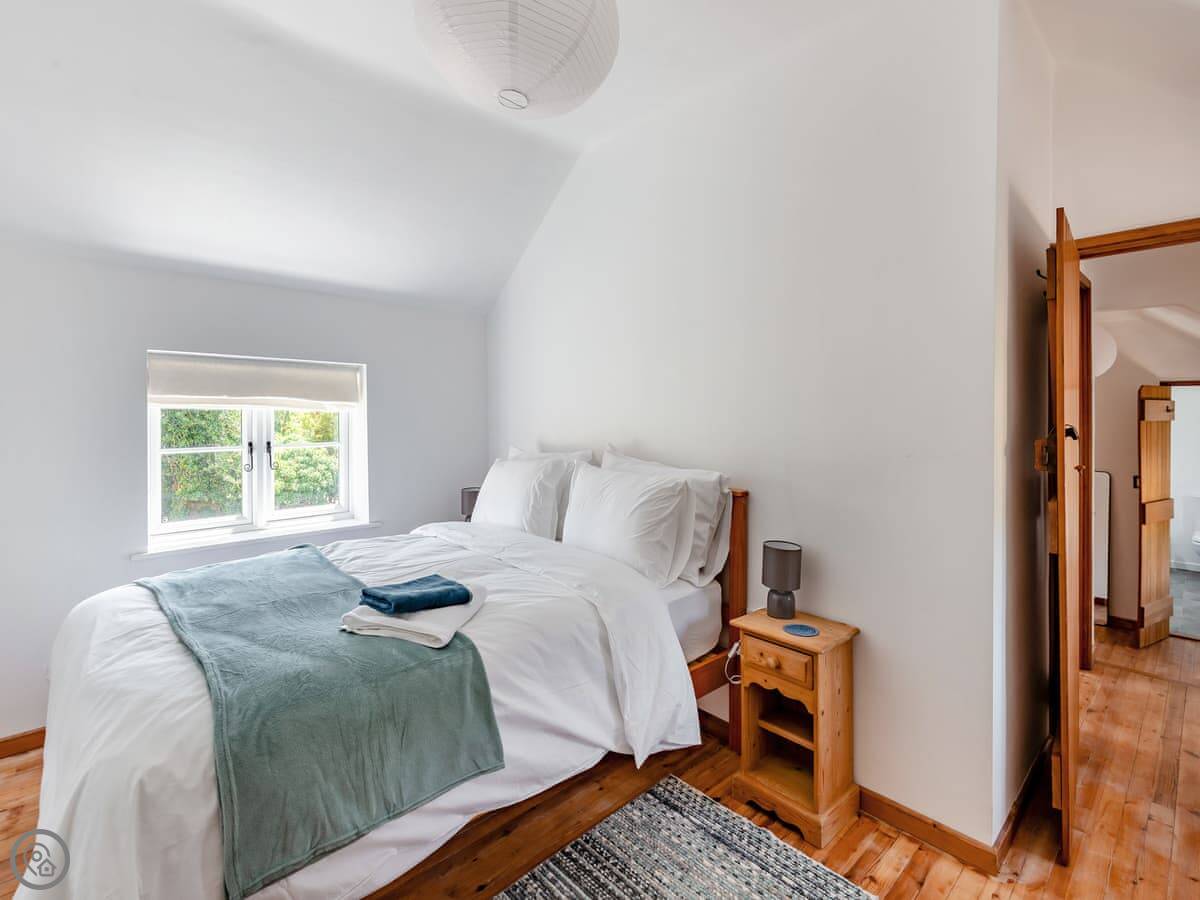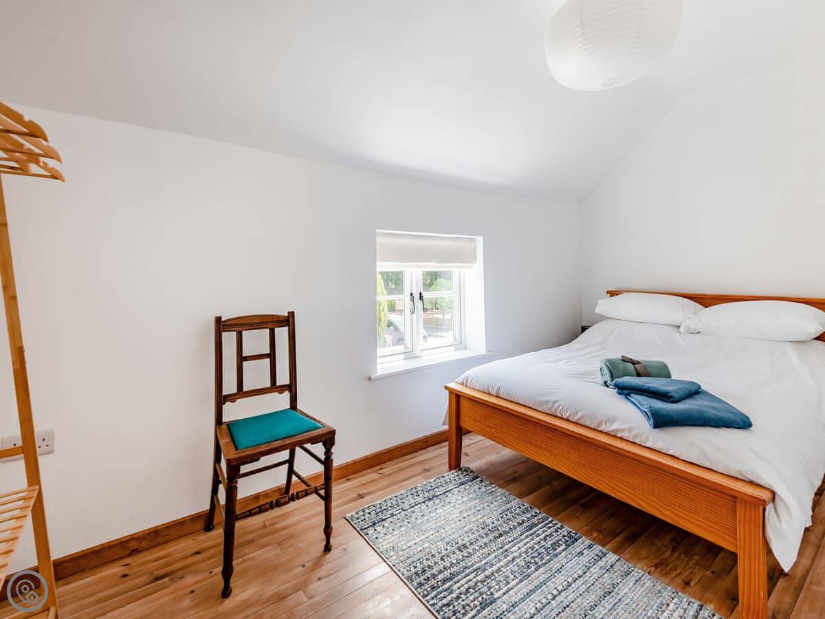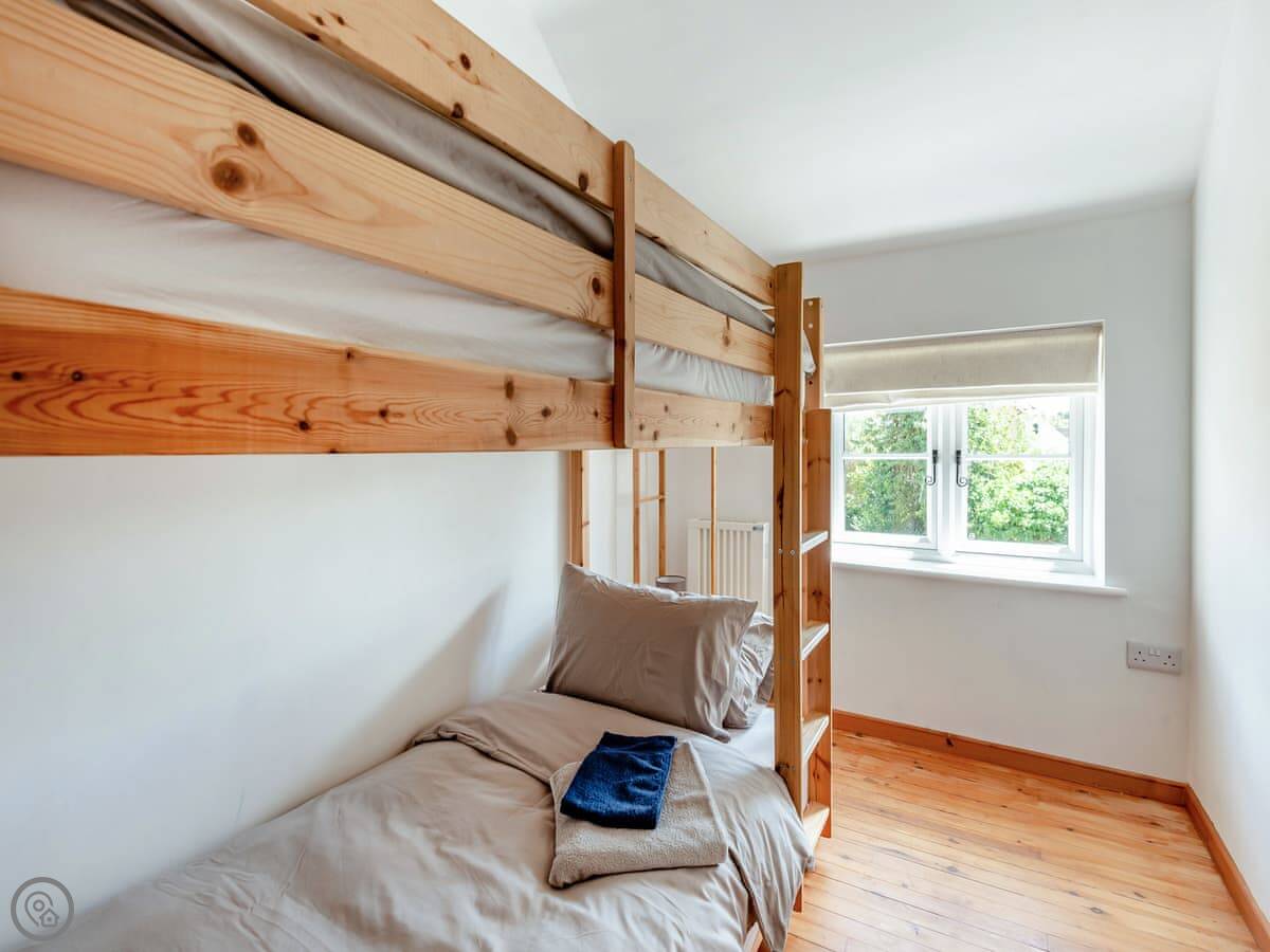 It sleeps six. Three bedrooms, two bathrooms. One's a shower room downstairs, the other is upstairs with a bath and shower. The master bedroom has a king size bed, the second has a double, and the third has bunk beds. It's a 4 Star place, which means it's comfortable and well-equipped.