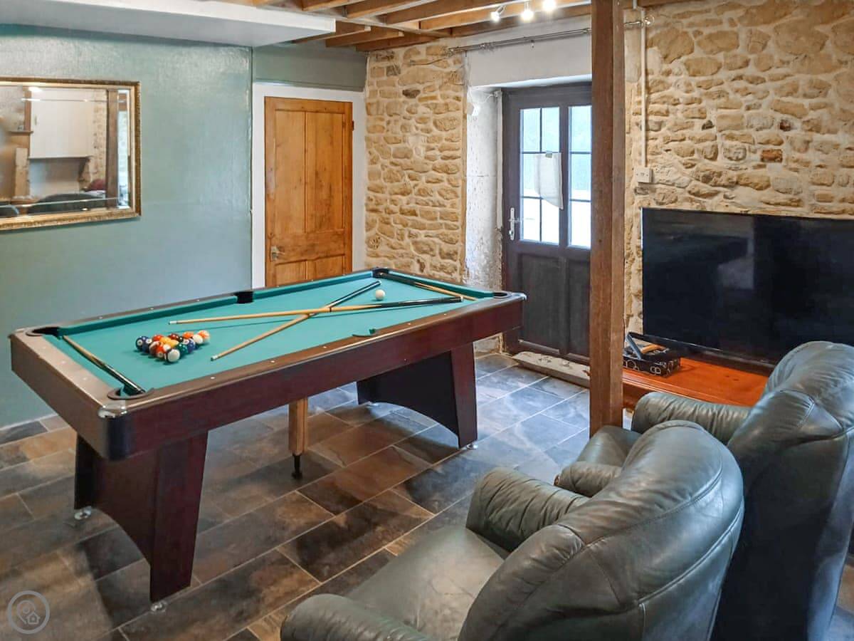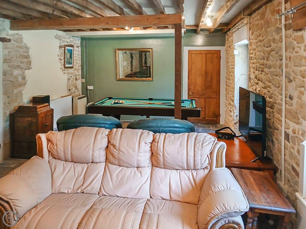 The kitchen is a good size for a group. There's a separate utility room with a washing machine. One sitting room has a pool table, the other is more for quiet. The garden is up a short path from the back door. It's got a patio.