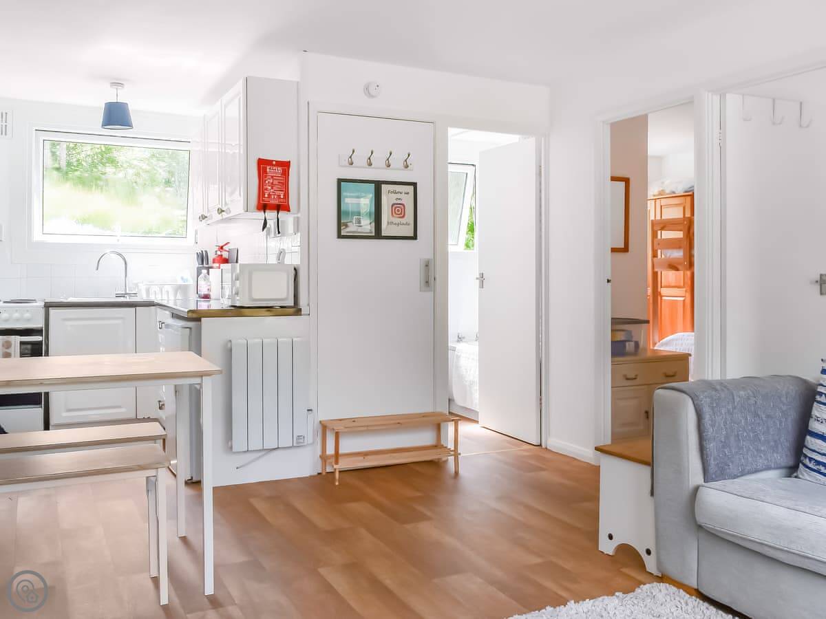 Everything's on one floor except for three steps up to the front door. The living space is all open plan: kitchen, dining table, sofa, and a TV on the wall. There's a picnic bench outside on a private patio.