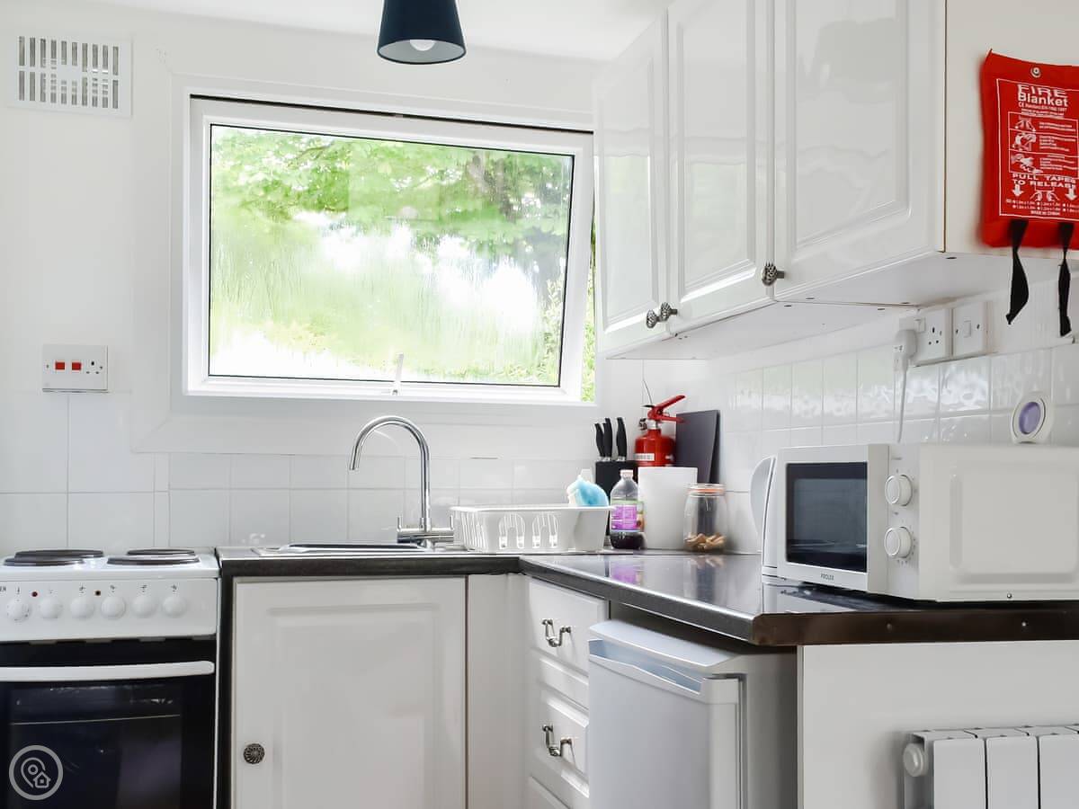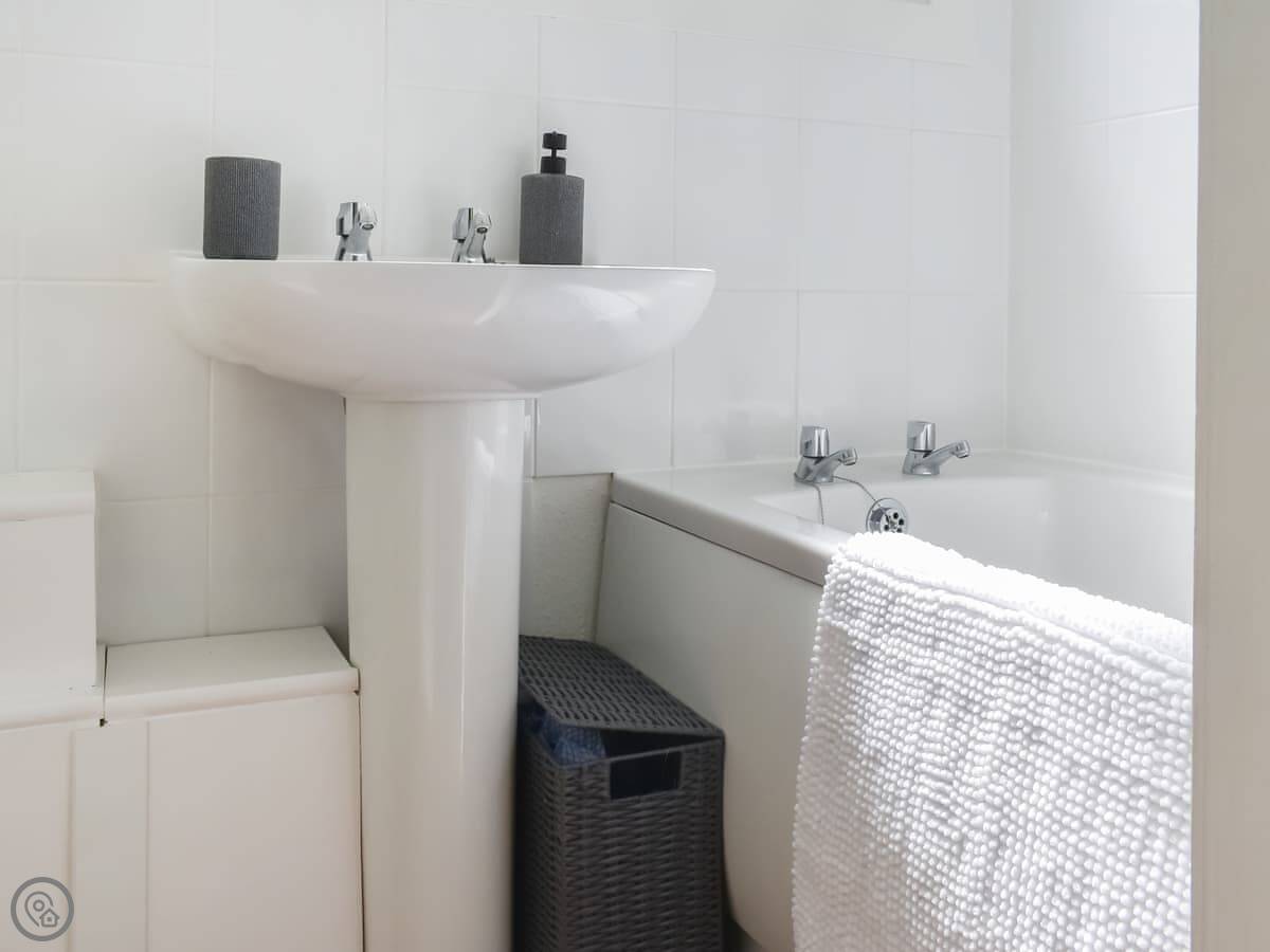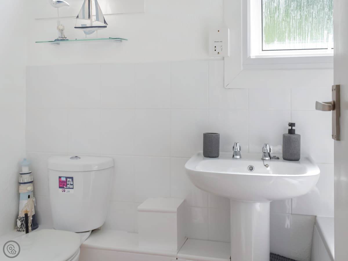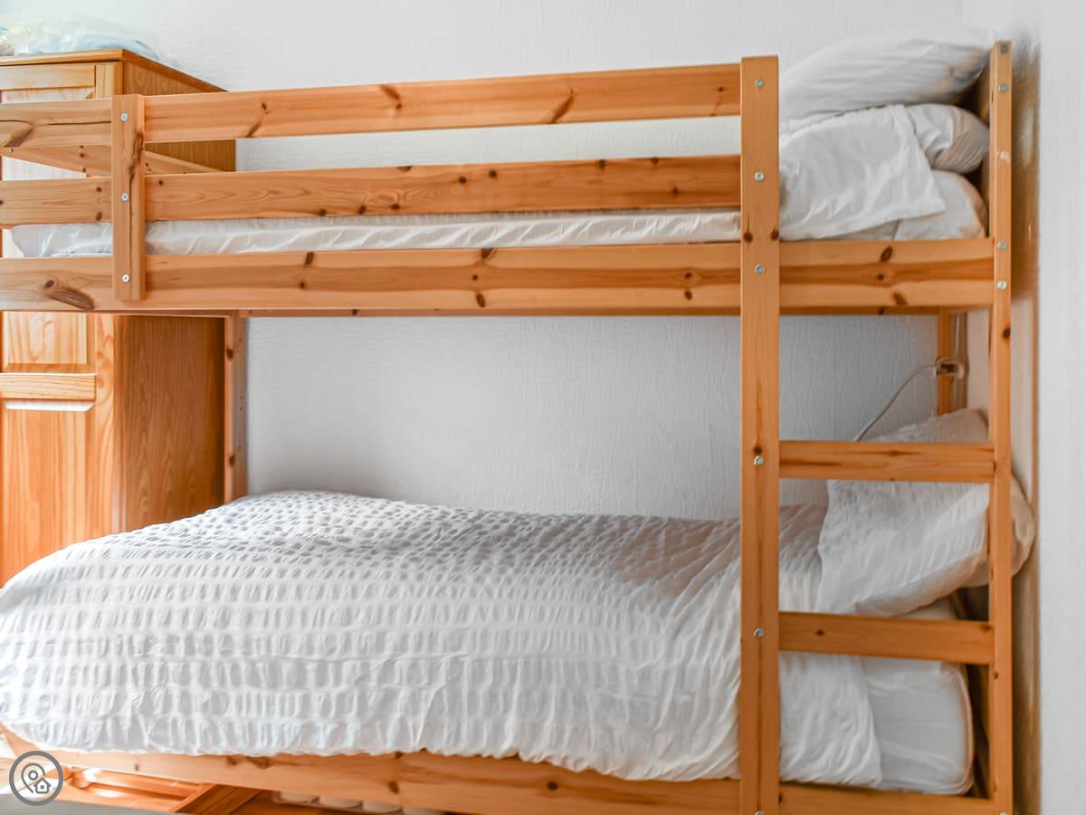It sleeps four. Two bedrooms, one bathroom. There's a double room and a bunk room. The bathroom has a bath with an electric shower over it. It's a 3 Star place, so it's tidy and functional.