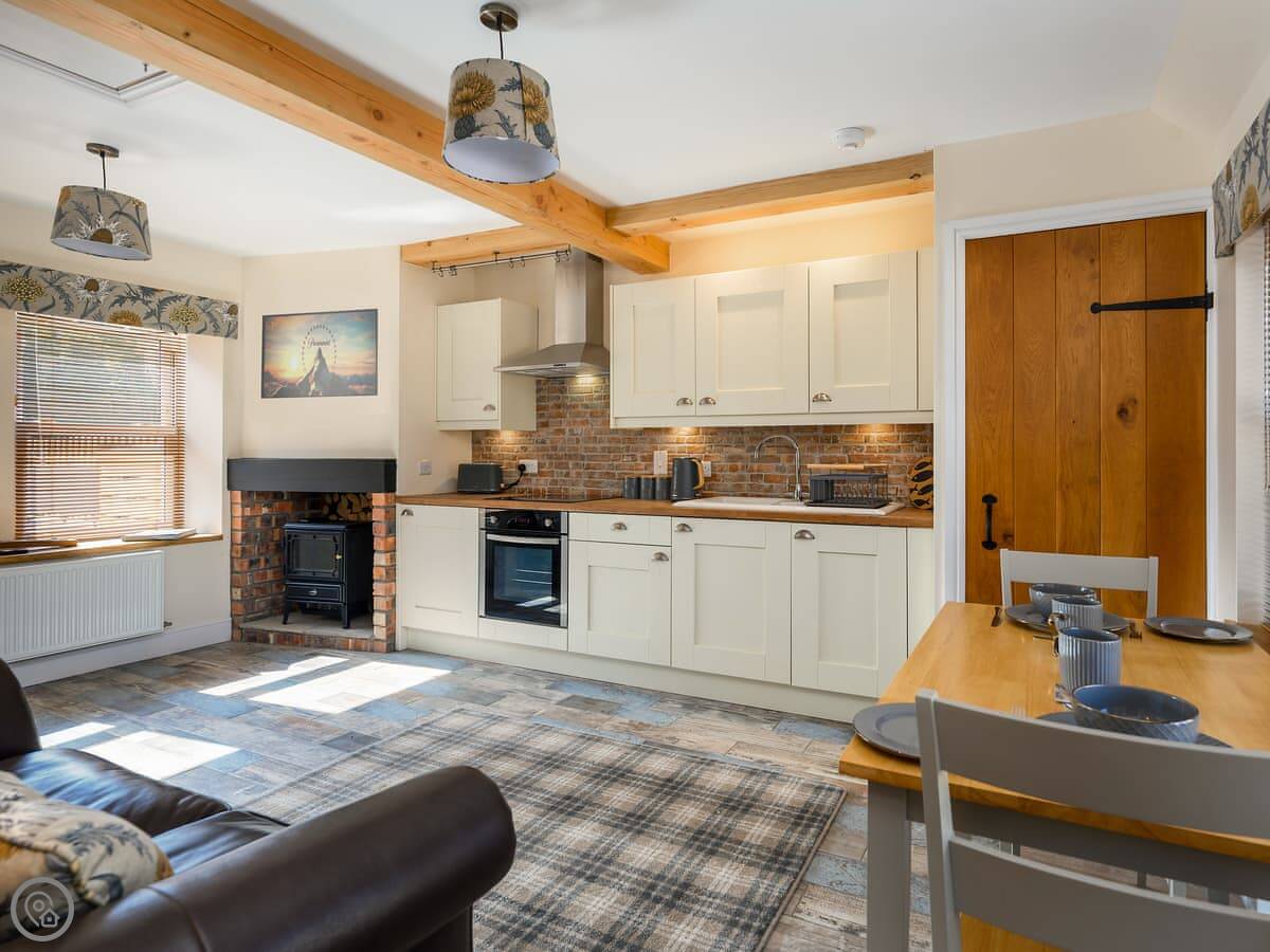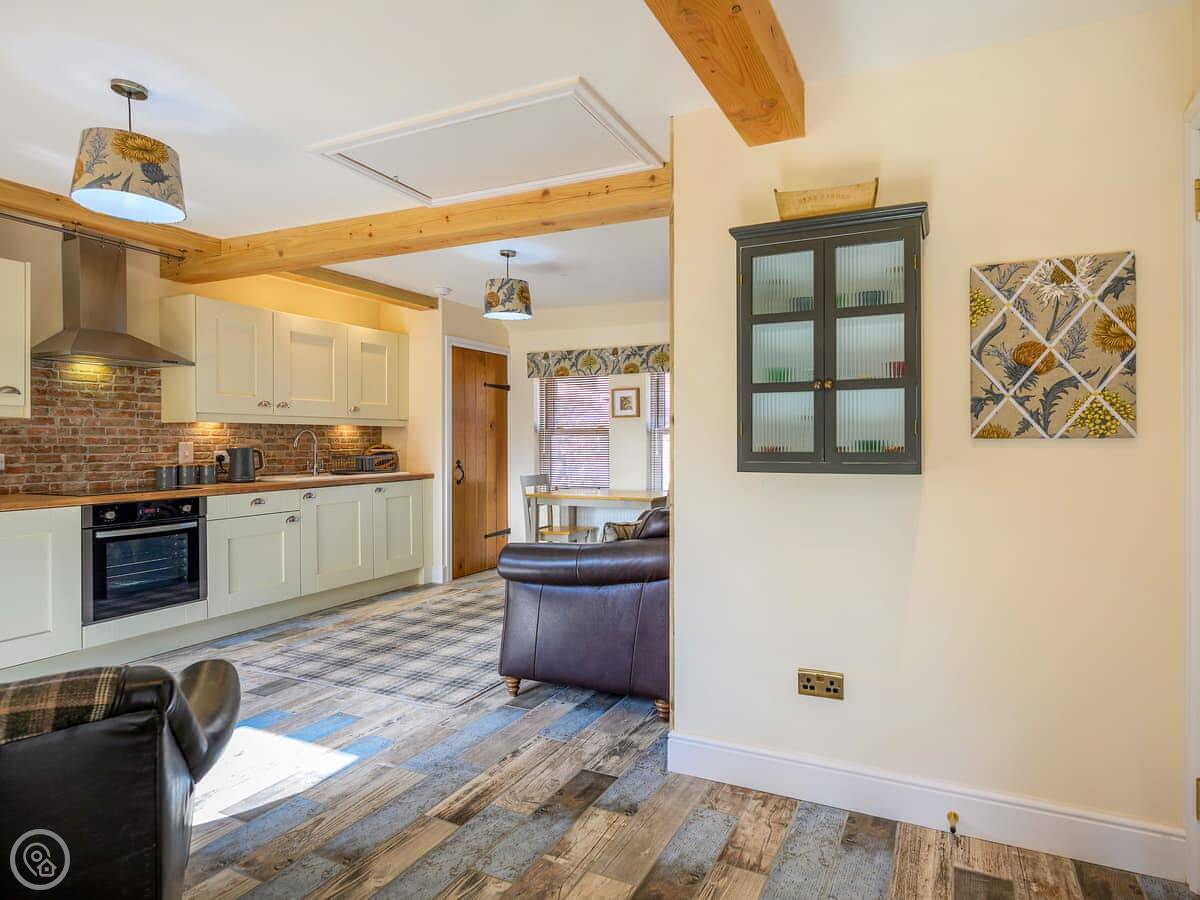 The main room is open plan. Living area, kitchen, table. There's a bedroom leading off it and a bathroom. The beams are original.