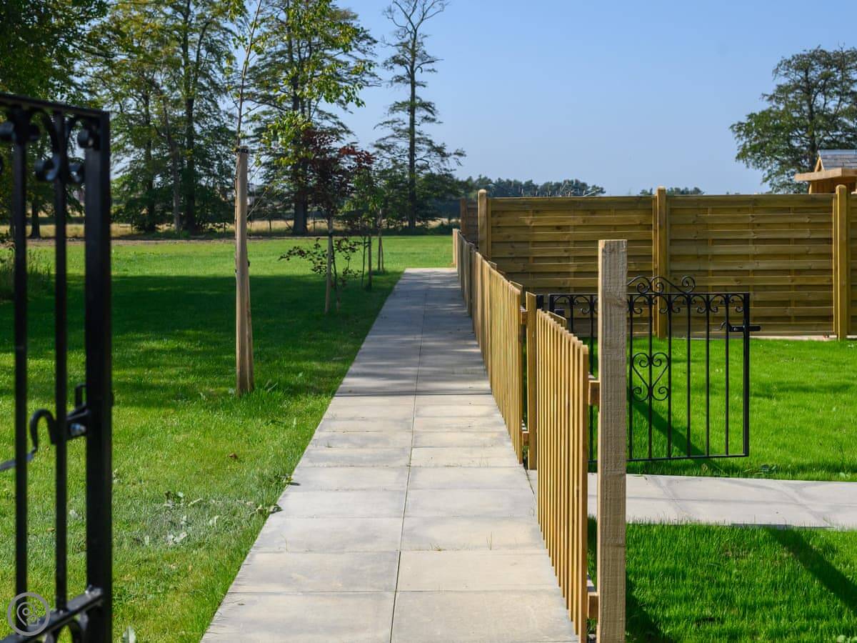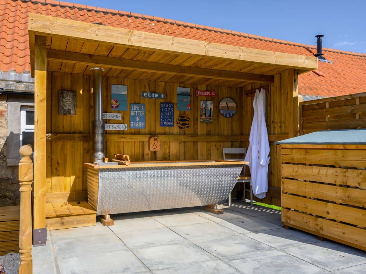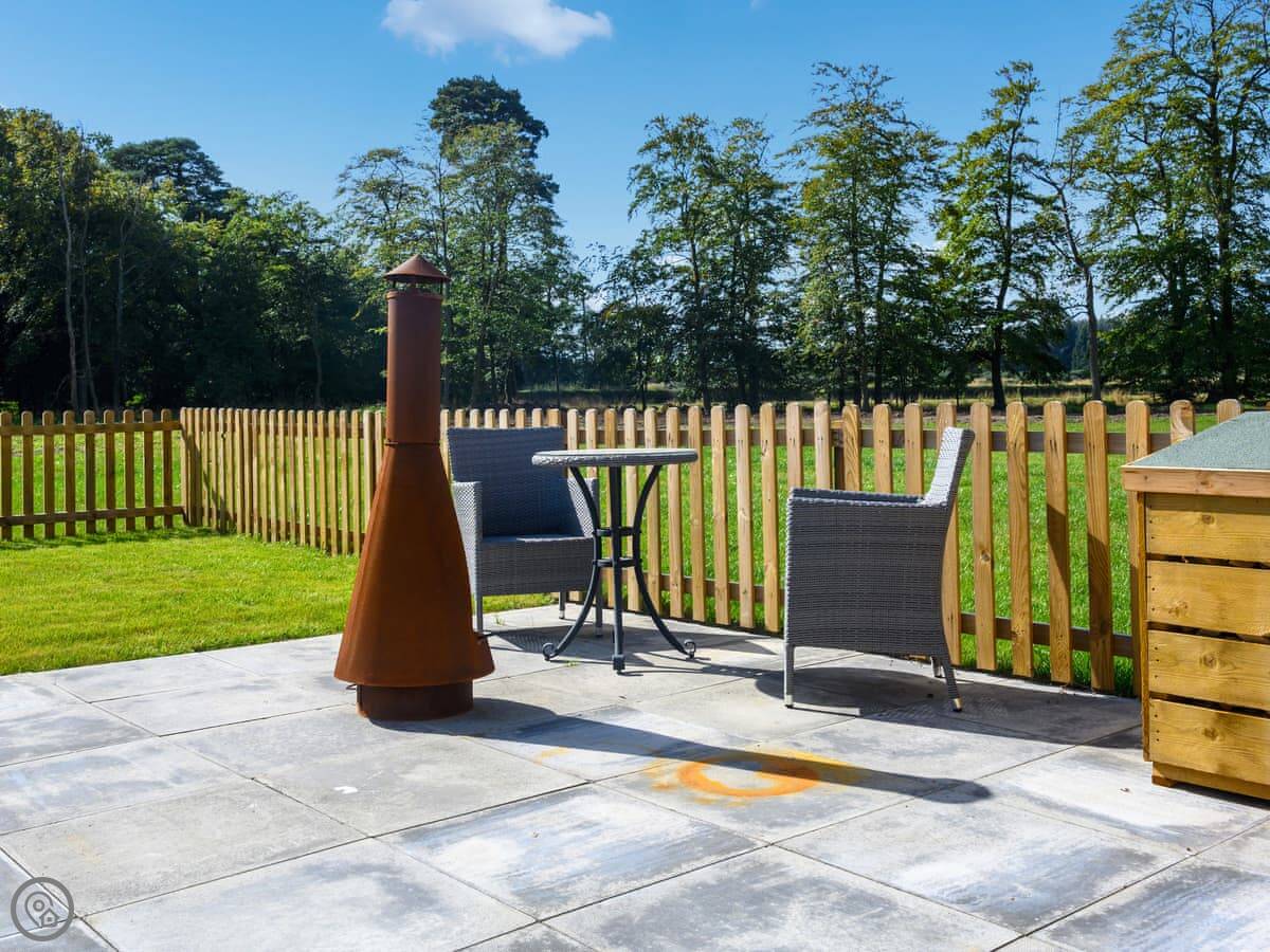 The garden is private and enclosed. It looks out over the fields. There's a wood-fired hot tub and a chimenea with some seating.