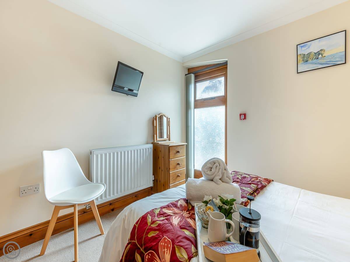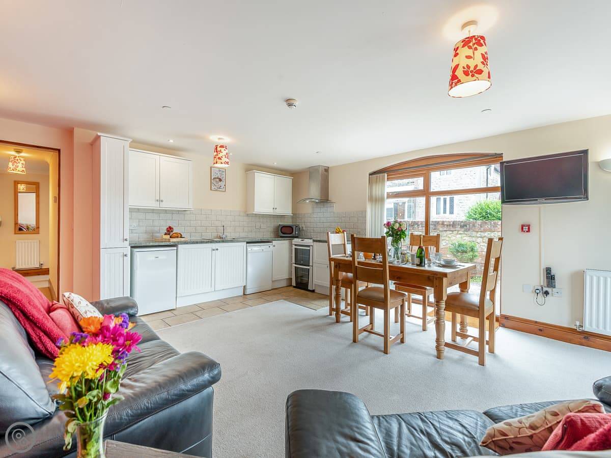 The Byre is a ground floor flat in a converted Victorian barn. The building was done in 2009, so inside it's modern and plain. Everything is on one level.