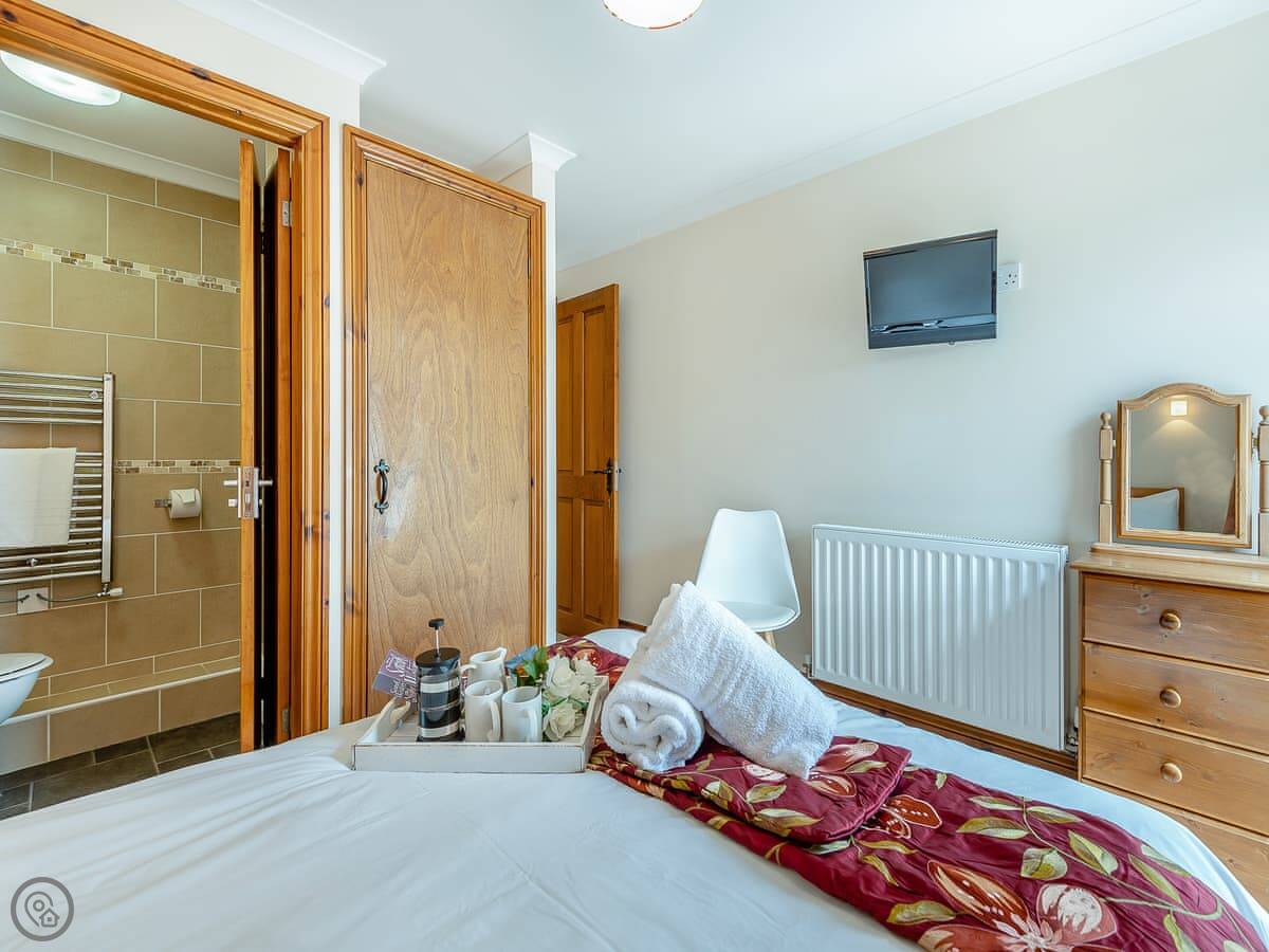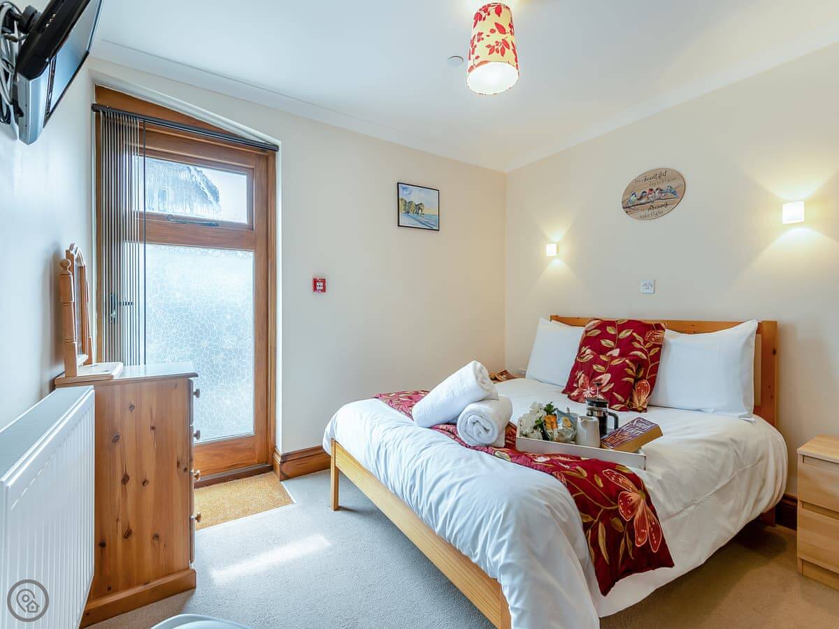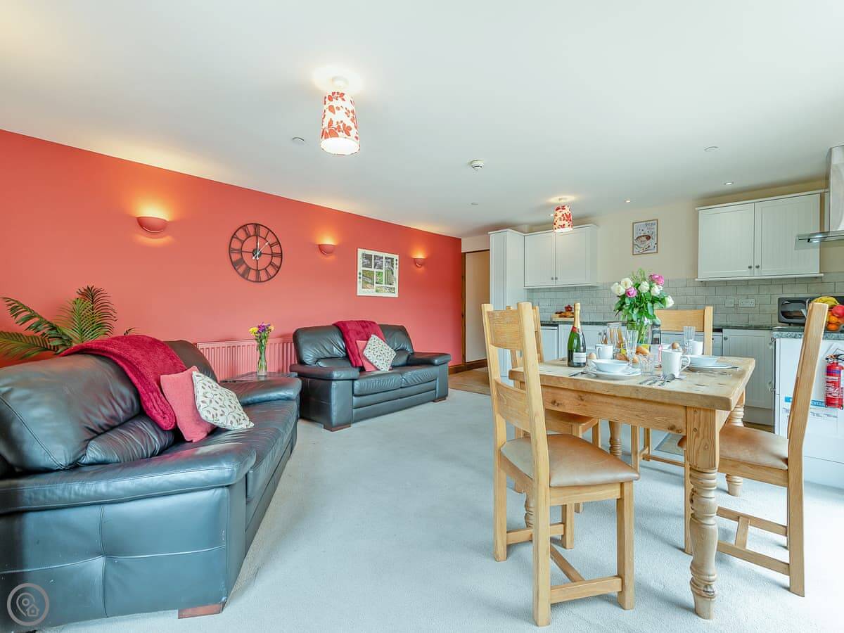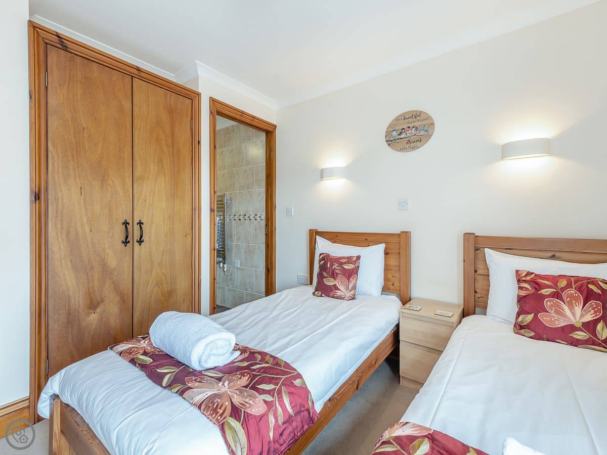 You get your own patio with a table and chairs. It catches the sun. The view is over a small lake on the estate. There's a shared games room and an indoor heated swimming pool you can use. The pool is good if the weather turns. There's also a play area for children.