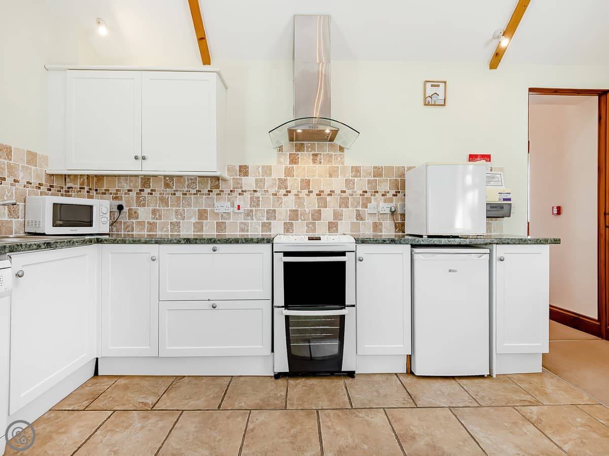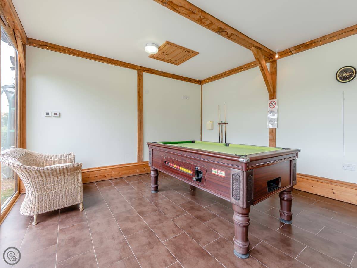 The barn is part of a small estate. You get use of the shared indoor swimming pool, which is handy. There's a games room with a snooker table. There are also a few fishing lakes on the grounds if that's your thing. Parking is right there, and there's an electric vehicle charger.