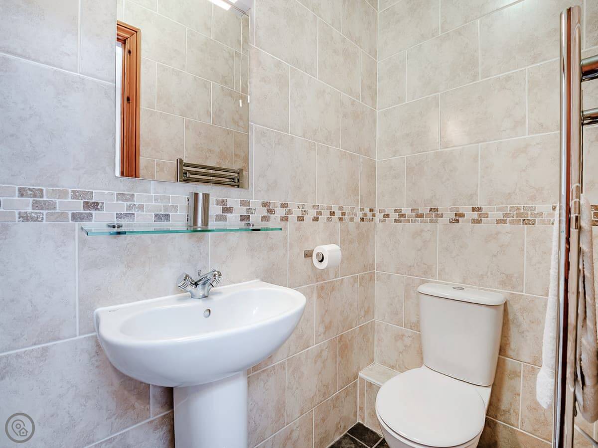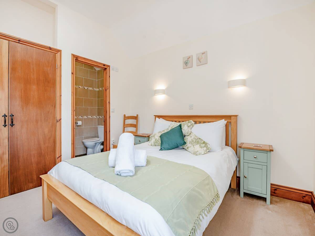 It's first floor, so you get to it by going up an external spiral staircase. It feels a bit more private that way. Inside it's open plan. Two bedrooms, both with their own bathrooms. It sleeps four. It's a Three Star place, so it's comfortable and clean, not high-end.