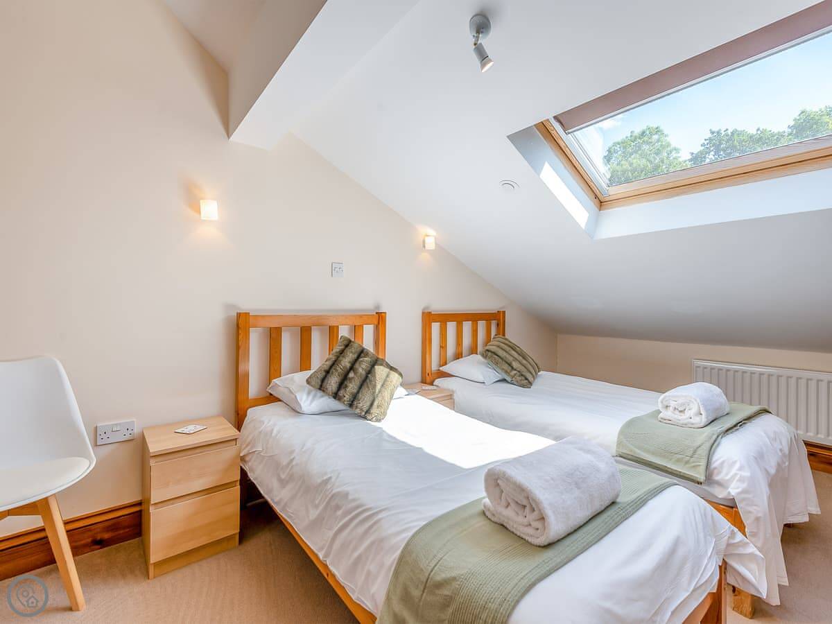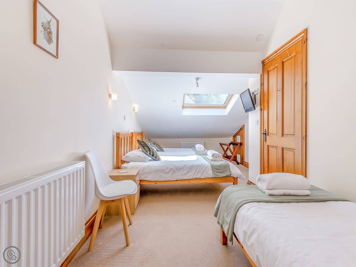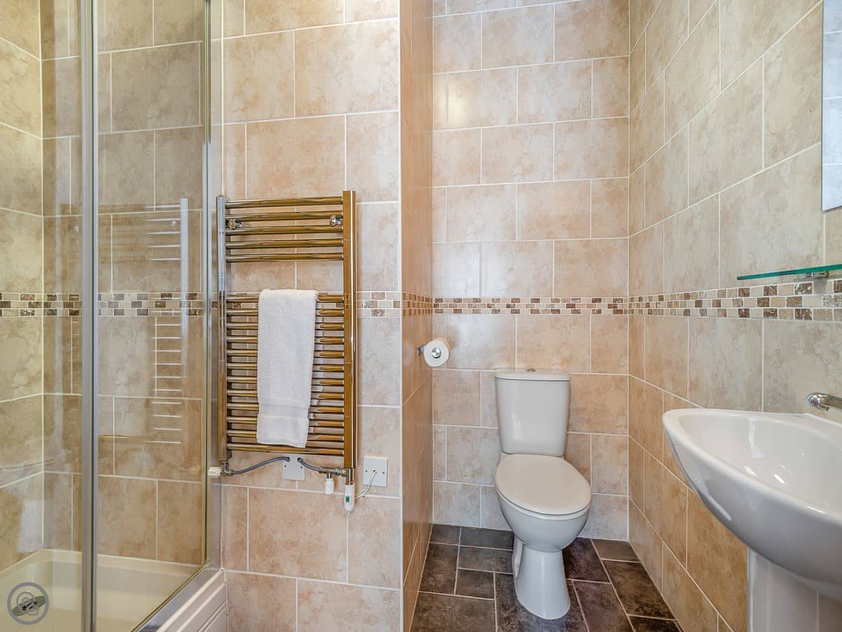 It sleeps four, maybe five if someone uses the single bed in one room. Two bedrooms, both with their own bathrooms. There's also a separate shower room downstairs. It's got a 3 Star rating. It's clean and comfortable. It's not a show home.