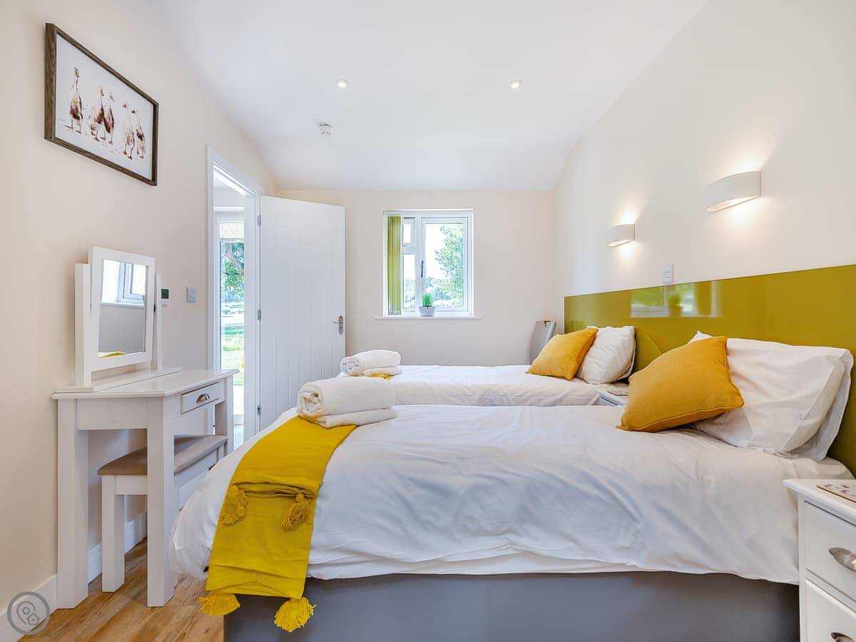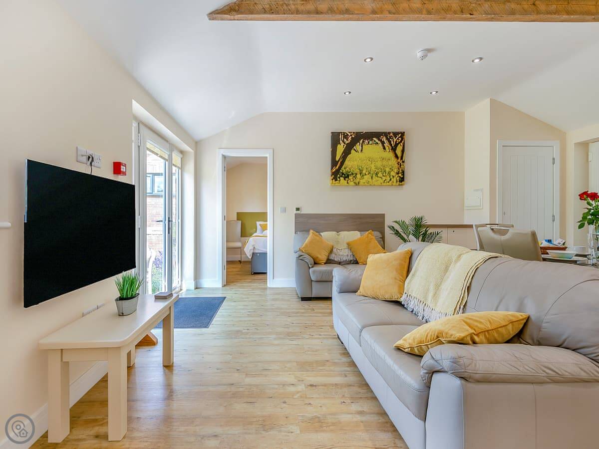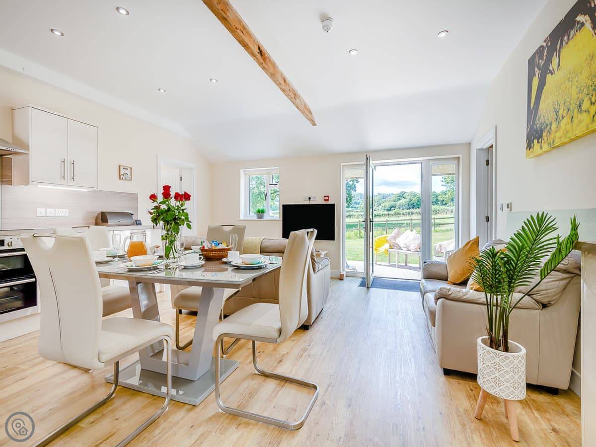 It sleeps up to six, with two bedrooms. Both bedrooms have zip and link beds, so you can have them as a king or two single beds. Each has its own ensuite shower room. The main bedroom also has a sofa bed if you need it. The living space is open plan: kitchen, dining table, and seating area all in one room. It's got underfloor heating, so it's always comfortable.