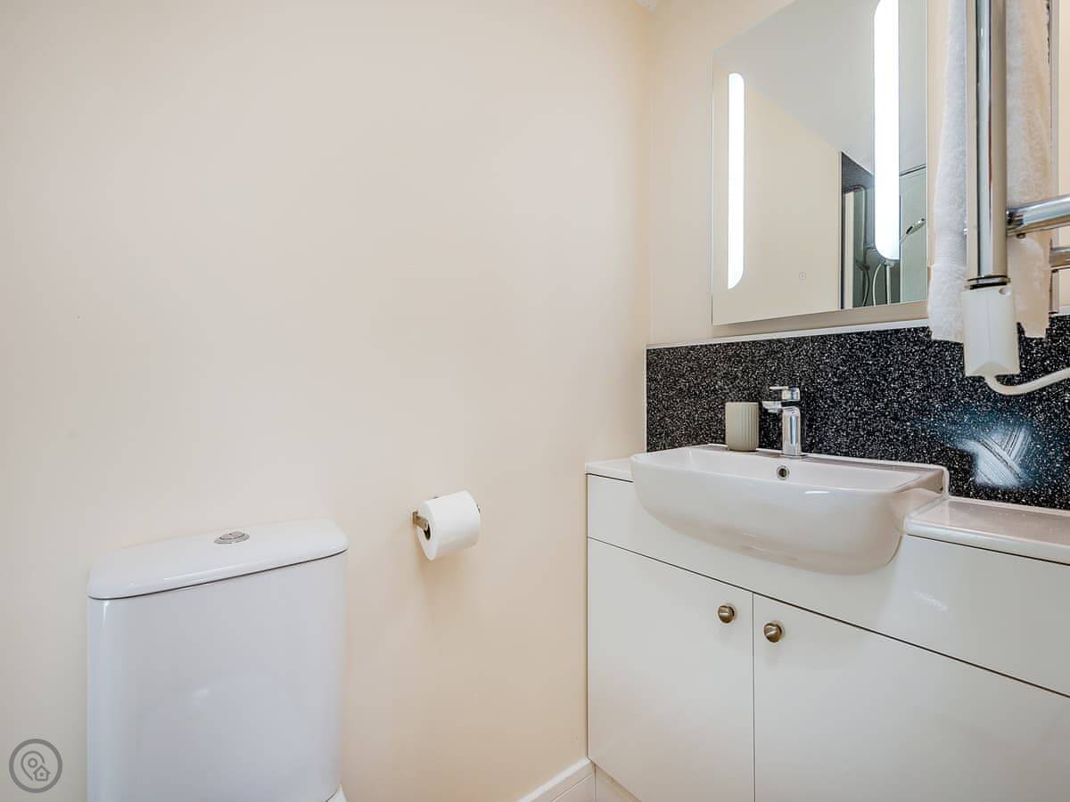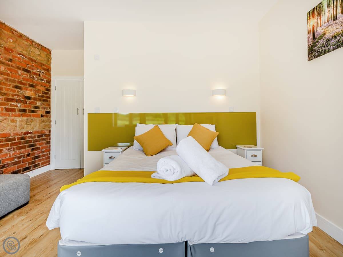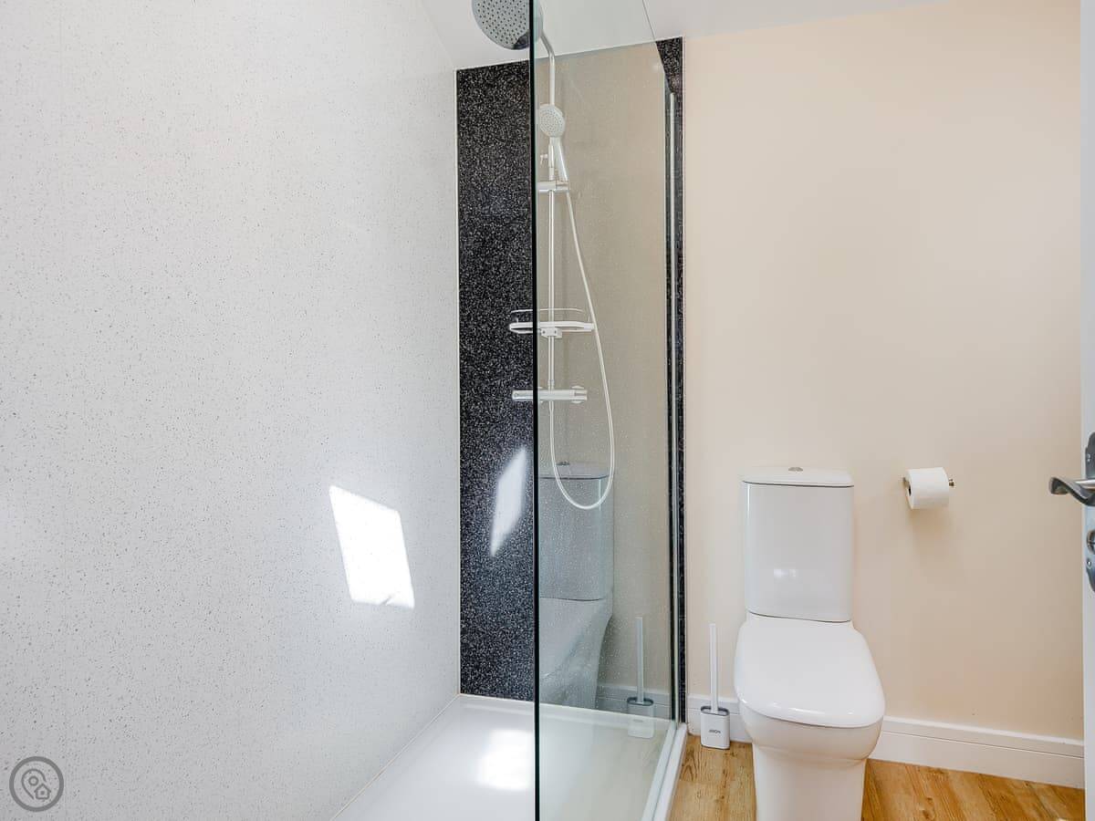 It sleeps up to six, with two bedrooms. Both bedrooms have zip and link beds, so you can have them as a king or two single beds. Each has its own ensuite shower room. The main bedroom also has a sofa bed if you need it. The living space is open plan: kitchen, dining table, and seating area all in one room. It's got underfloor heating, so it's always comfortable.